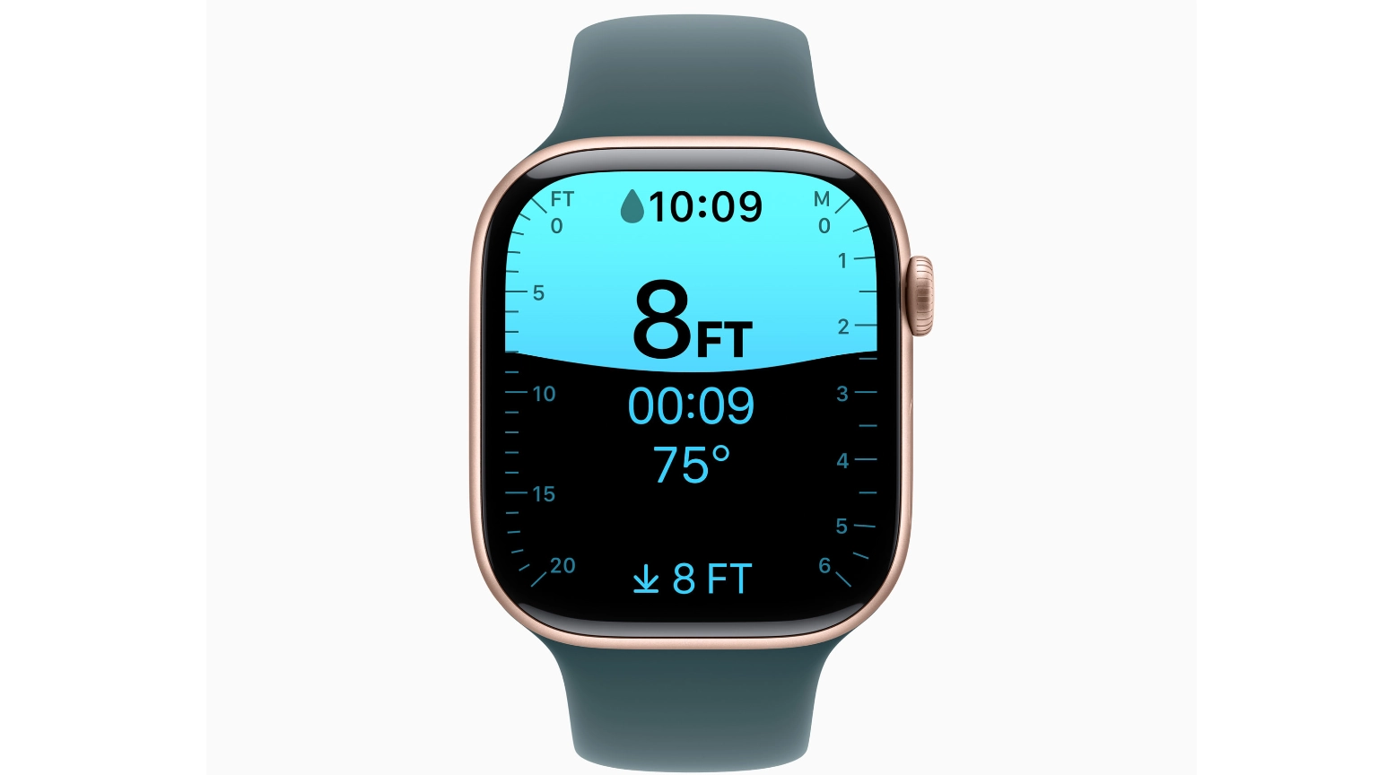 ตัววัดความลึกใหม่สามารถวัดใต้ผิวน้ำได้ลึกถึง 6 เมตร จึงเหมาะสำหรับดำน้ำสนอร์เกิลและดำน้ำตื้น หรือจะใส่ว่ายเล่นในสระ ทะเลสาบ หรือทะเลก็ทำได้ นอกจากนี้ เซ็นเซอร์วัดอุณหภูมิน้ำใหม่ยังสามารถวัดอุณหภูมิน้ำได้ทันทีที่ Apple Watch อยู่ใต้ผิวน้ำ