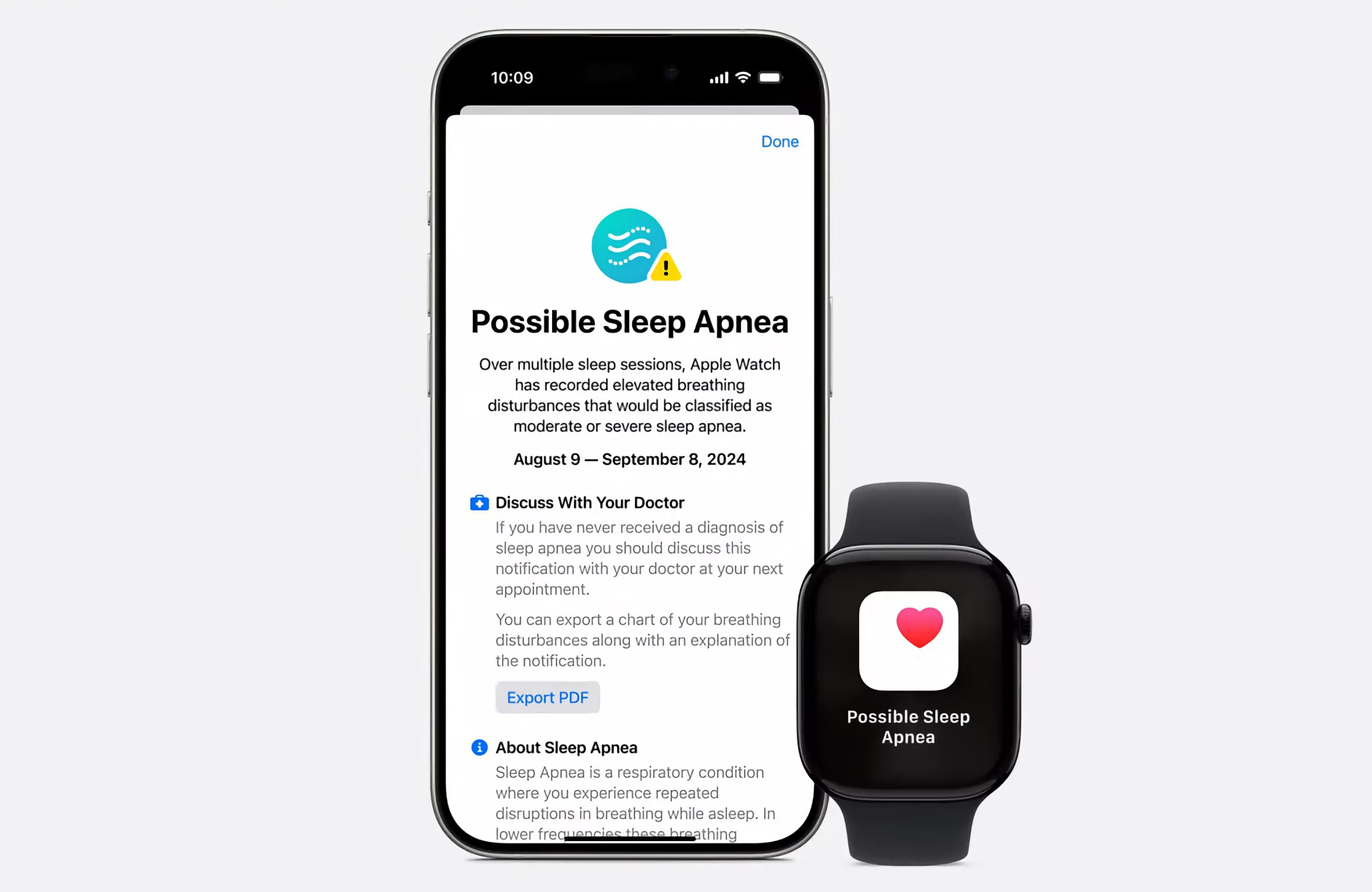 คุณสมบัติใหม่ใน Apple Watch Series 10 คือ การแจ้งเตือนภาวะหยุดหายใจขณะหลับ (Sleep Apnea) ซึ่งฟีเจอร์นี้ถูกเพิ่มใน Apple Watch Series 9 และ Apple Watch Ultra รุ่นที่ 2 ด้วย แต่ฟีเจอร์นี้ยังไม่เปิดใช้งานในไทย คาดว่าจะเปิดให้ใช้งาน 150 ประเทศทั่วโลก โดยเริ่มจากสหรัฐอเมริกา ยุโรป และญี่ปุ่นก่อน