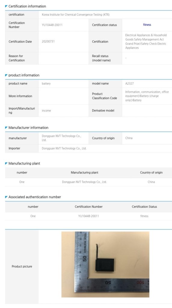 จากฐานข้อมูลของสถาบันการทดสอบและวิจัยของเกาหลี พบข้อมูลที่มีลักษณะเป็นแบตเตอรี่ที่มีขนาดเล็ก คาดว่าน่าจะเป็นแบตเตอรี่ของ Apple Watch Series 6 หรืออาจจะเป็นแบตเตอรี่ของเคส AirPods แต่จากรูปร่างที่พบนั้นมีลักษณะคล้ายกับแบตเตอรี่ของ Apple Watch มากกว่า
