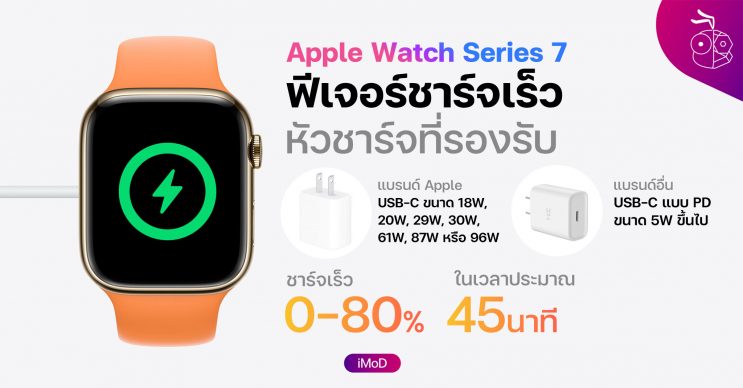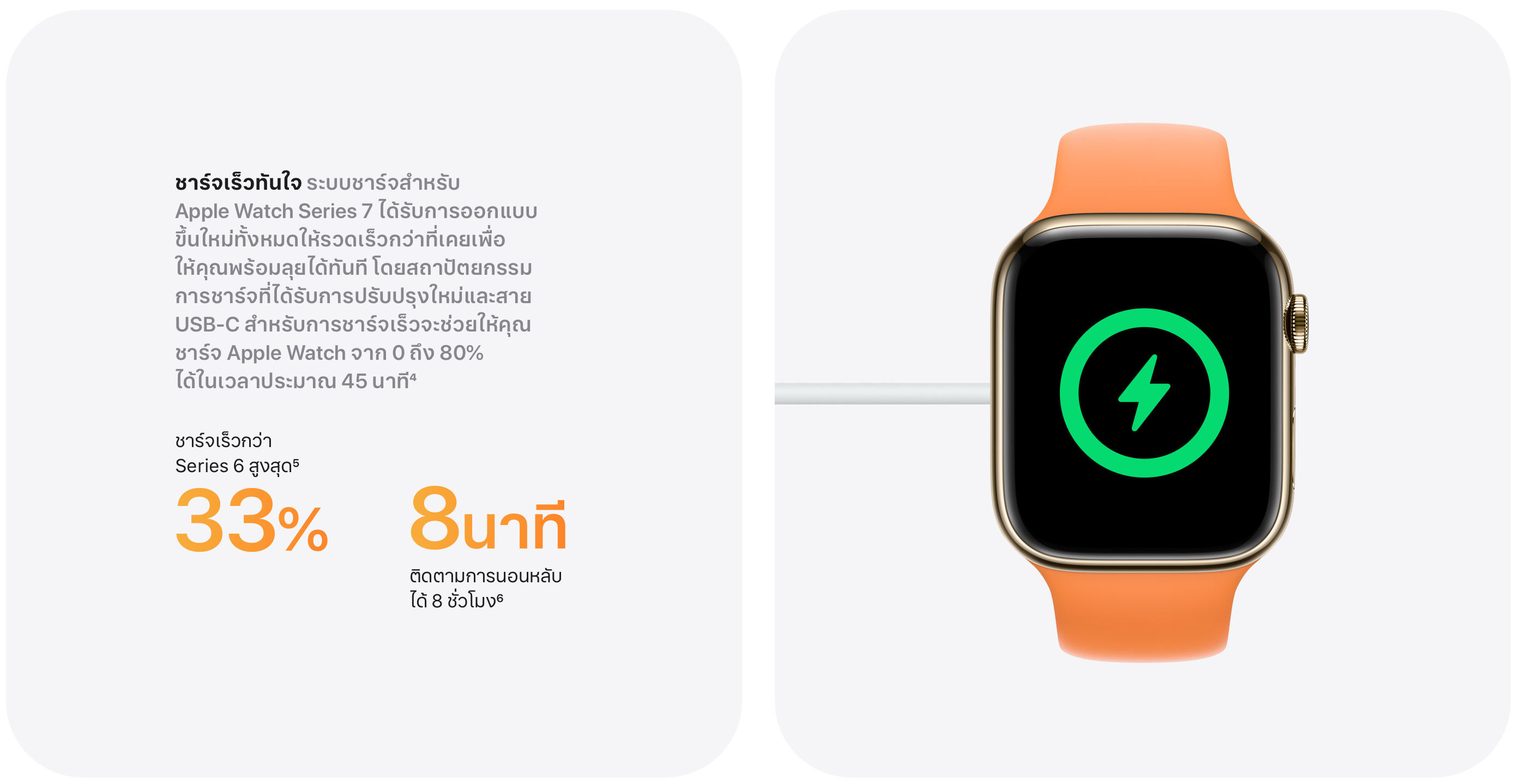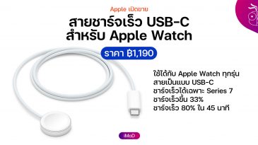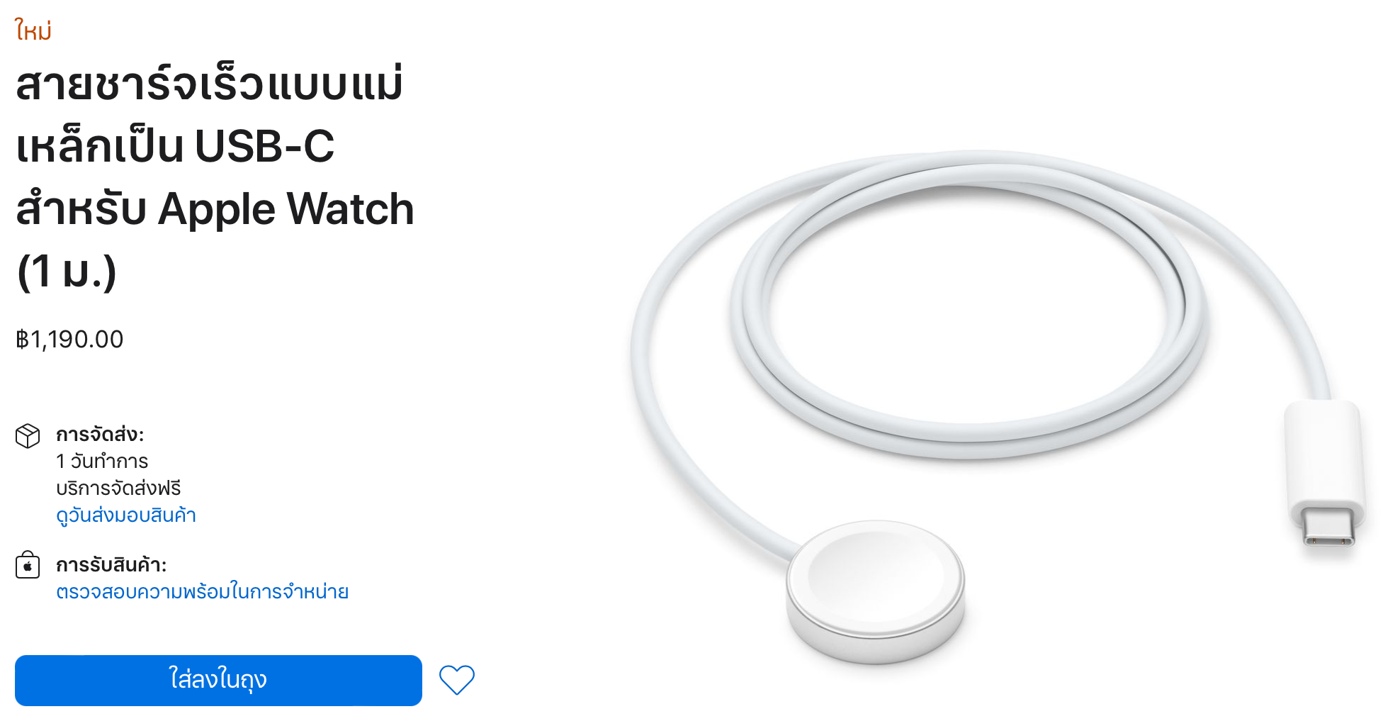 Apple เปิดขายสายชาร์จเร็วแบบแม่เหล็กเป็น USB‑C แยกเช่นกันราคา 1,190 บาท, รองรับ Apple Watch ทุกรุ่น แต่ฟีเจอร์ชาร์จเร็วจะรองรับเฉพาะ Series 7 เท่านั้น