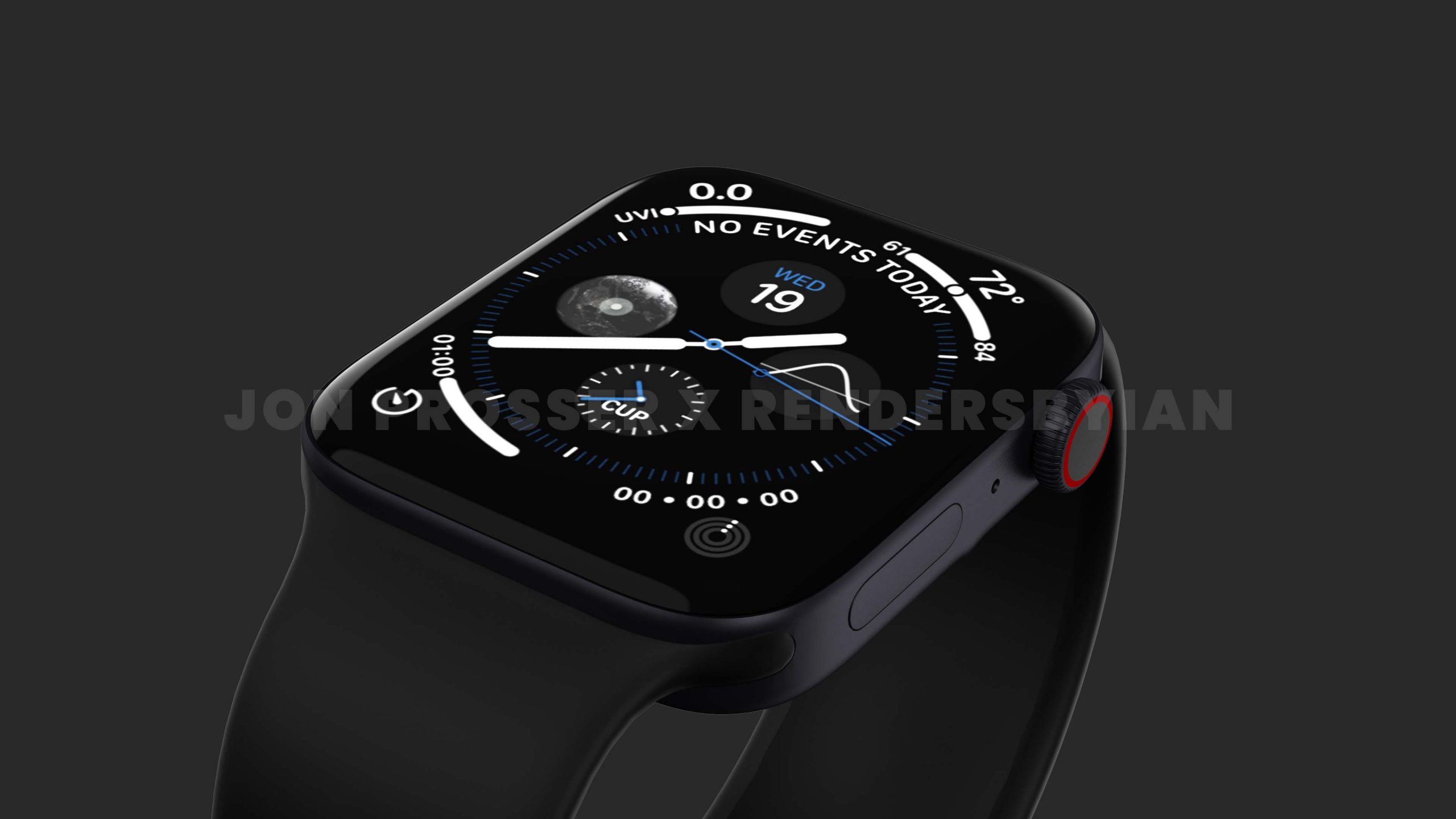 Prosser ได้แชร์ภาพเรนเดอร์ของ Apple Watch ตัวใหม่ โดยขนาดหน้าจอจะยังเท่าเดิม ซึ่งแหล่งข่าวของ Prosser เผยว่า Apple กำลังพยายามลดขนาดขอบจอ Apple Watch ลง เพื่อให้มีพื้นที่แสดงผลมากขึ้น