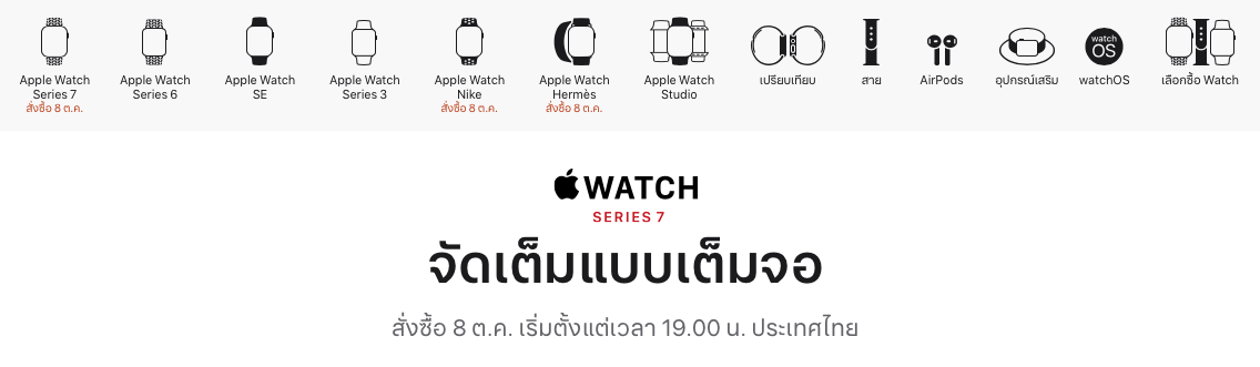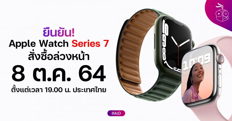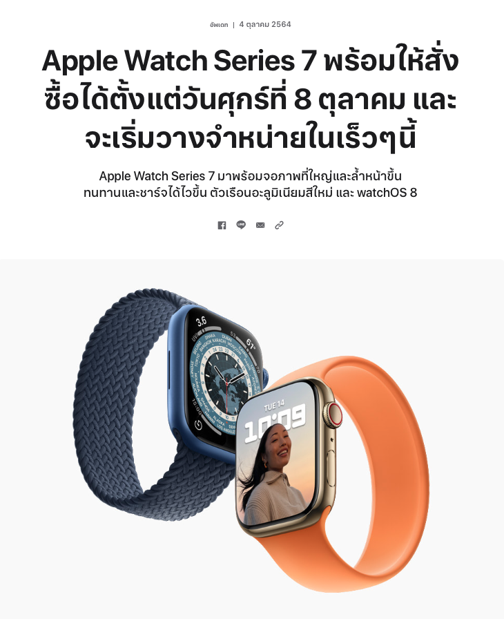 4 ต.ค. 64, Apple ประกาศหน้าเว็บว่า Apple Watch Series 7 เปิดให้สั่งซื้อล่วงหน้าวันที่ 8 ต.ค. 64 นี้ แต่ยังไม่ระบุว่าจะวางขายหน้าร้านเมื่อไหร่