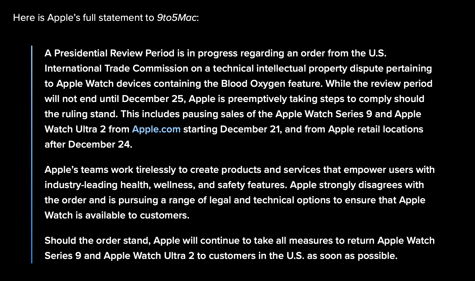 (โดย Apple Watch Series 9, Ultra 2 ยังเปิดขายตามปกติในประเทศอื่น ๆ ไม่มีผลกระทบแต่อย่างใด)
