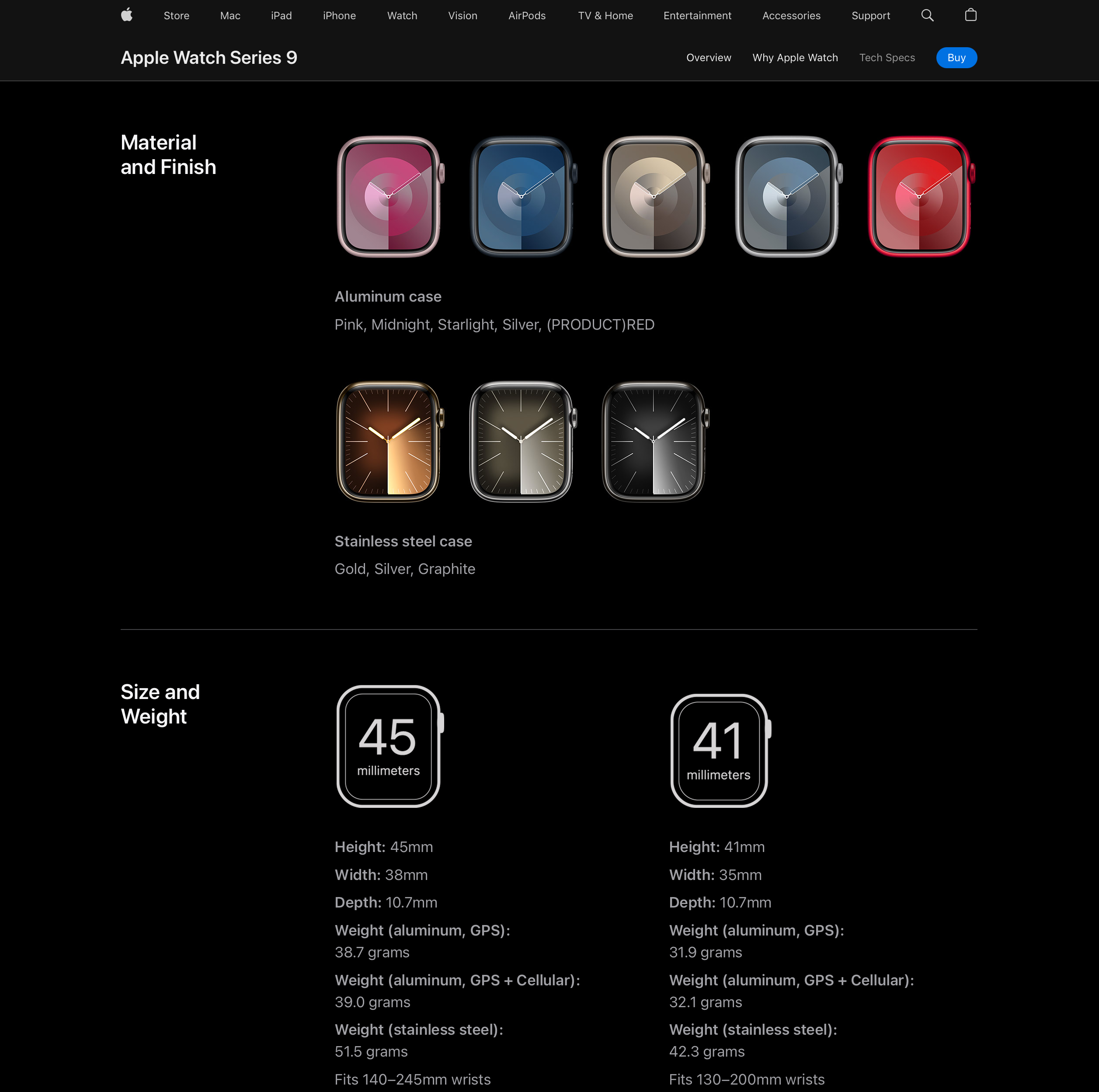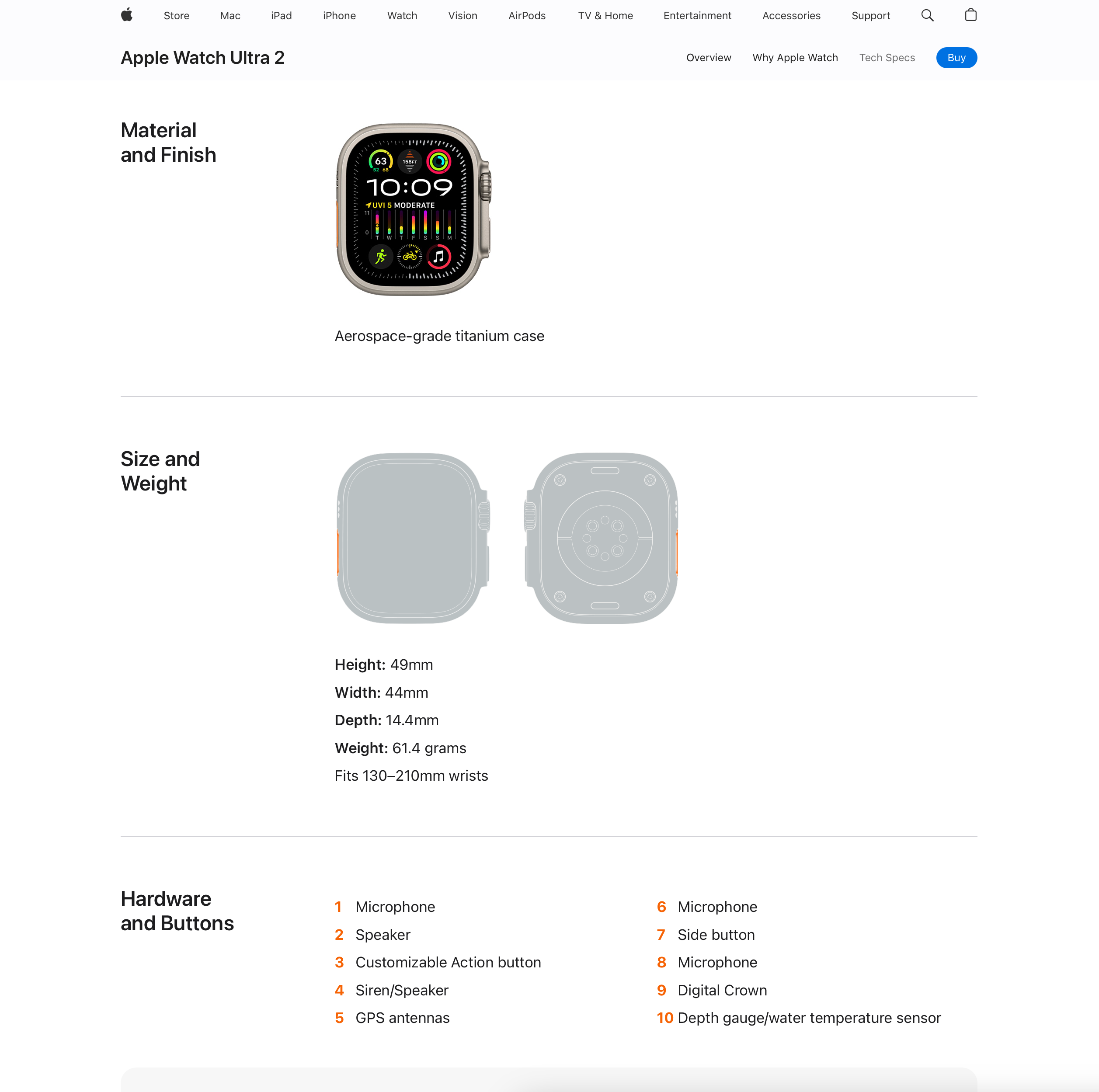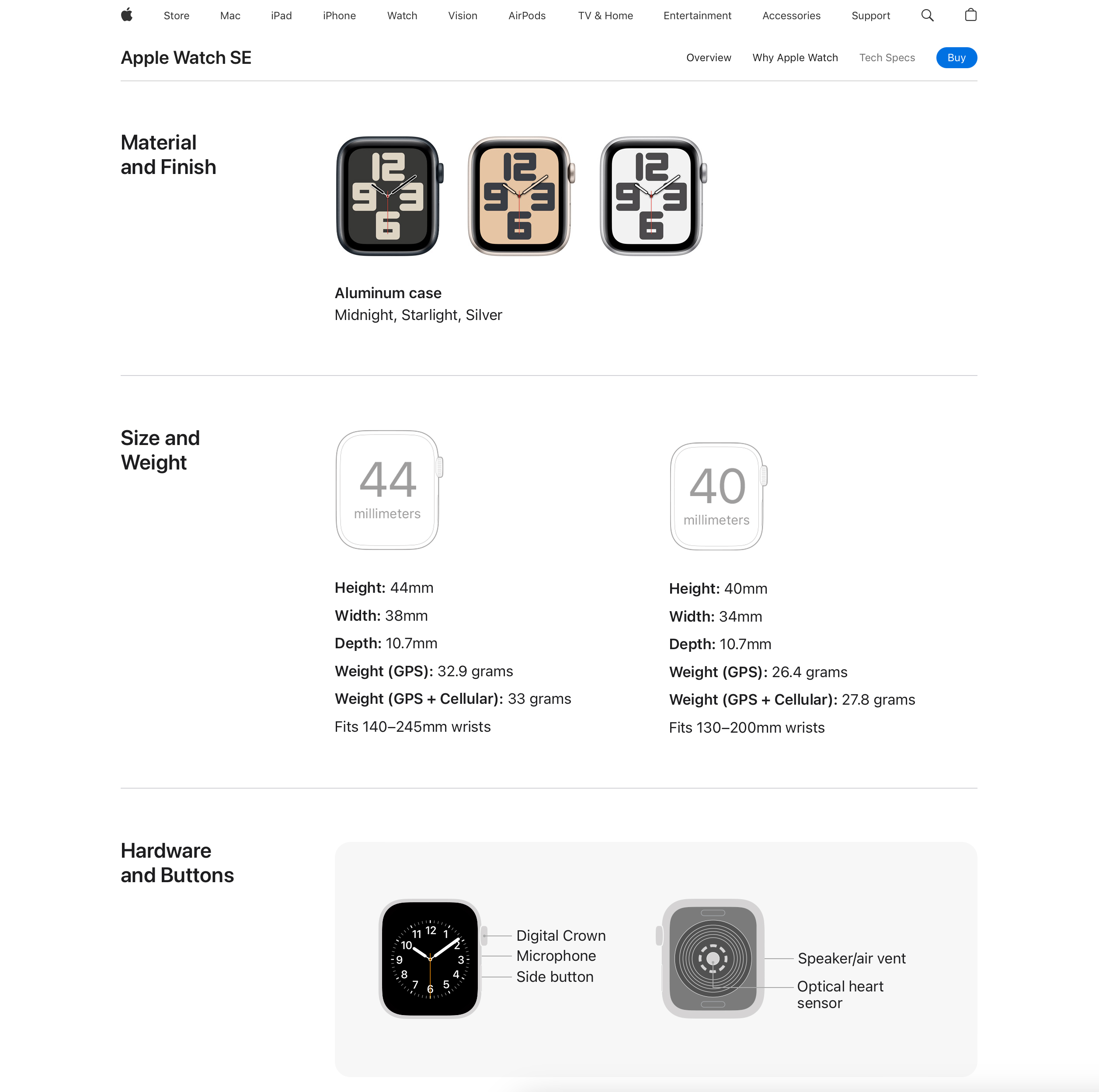 หน้า Tech Specs ของ Apple Watch นั้นจะมีข้อมูลรายละเอียดของ Apple Watch แต่ละรุ่น เช่น วัสดุ ขนาด น้ำหนัก ปุ่ม การควบคุม ชิป เซ็นเซอร์ และอื่น ๆ