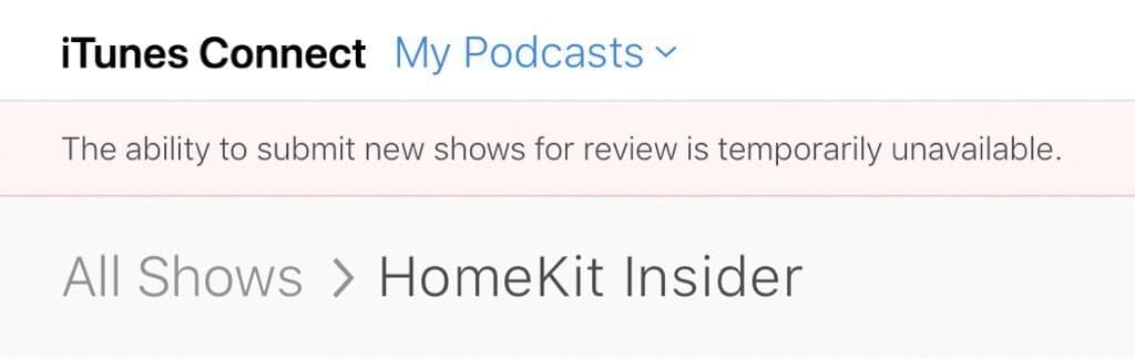 appleInsider พบข้อความแสดงข้อผิดพลาดใหม่ในส่วน My Podcasts ของ iTunes Connect การแก้ไขพอดคาสต์ใน HomeKit Insider พบการแจ้งเตือนที่ระบุว่า: “The ability to submit new shows for review is temporarily unavailable.” ซึ่งไม่มีการระบุว่า Apple จะเริ่มเปิดรับพอดคาสต์ใหม่อีกครั้งเมื่อไหร่