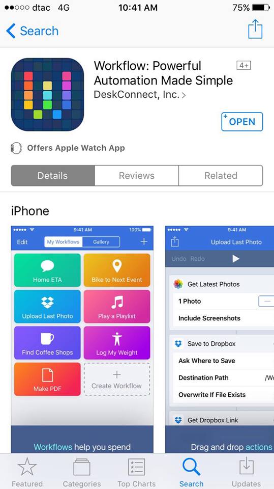 Workflow แอปสร้างลำดับการทำงานอัตโนมัติ ทีช่วยให้คุณลากวาง (Drag & Drop) สร้างลำดับขั้นตอนการทำงานหรือการกระทำของคุณ (Action) ได้มากกว่า 200 รูปแบบ ยกตัวอย่างเช่น การสร้างลำดับการทำงานให้มีการ ถ่ายรูป > เปิดโหมดแต่งรูป > บันทึกลงแอป Photo > แล้วโพสต์ลง Facebook เป็นต้น