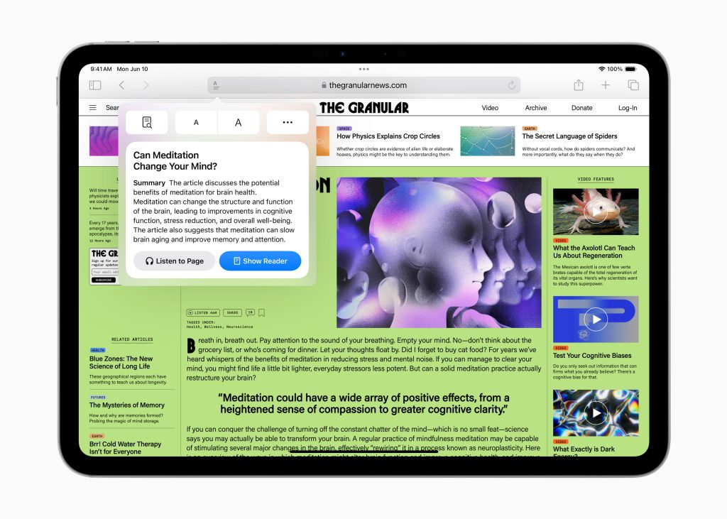 - คุณสมบัติการช่วยการเข้าถึงมาพร้อม Eye Tracking ซึ่งเป็นตัวเลือกที่มาพร้อมเครื่องสำหรับการควบคุม iPad โดยใช้เพียงสายตา และ Vocal Shortcuts ที่ช่วยให้ผู้ใช้ทำสิ่งต่างๆ ได้โดยการออกเสียงในแบบของตัวเอง