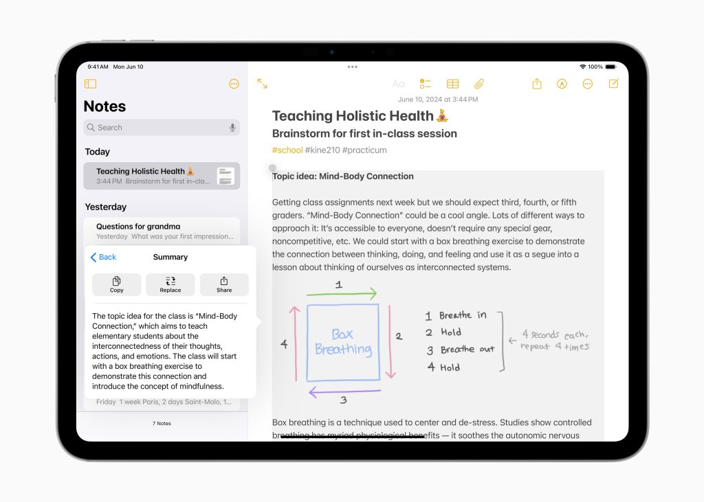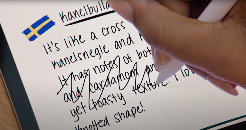 ยิ่งไปกว่านั้น ผู้ใช้ยังสามารถใช้ Apple Pencil เพื่อเว้นวรรค ขีดฆ่าประโยค หรือแม้แต่คัดลอกข้อความพิมพ์มาวางเป็นลายมือของตัวเอง โดยจะมีการปรับองค์ประกอบในย่อหน้าให้พอดีกับเนื้อหาใหม่โดยอัตโนมัติ