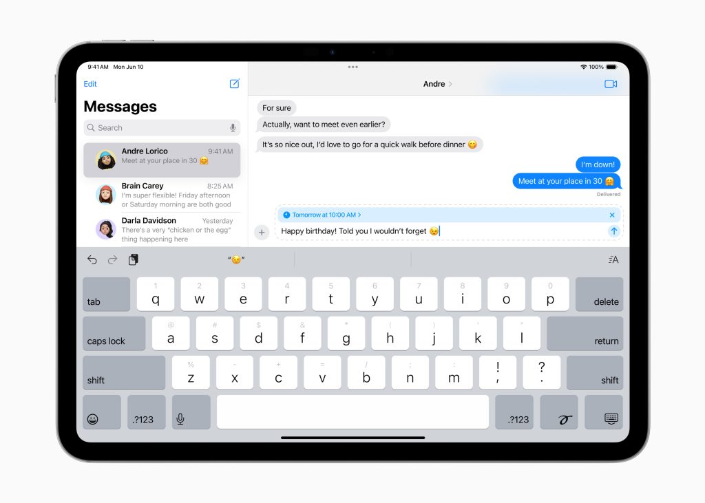 และยังมี Tapback ที่ออกแบบใหม่เพื่อให้ผู้ใช้สามารถโต้ตอบกับข้อความด้วยอิโมจิหรือสติกเกอร์อะไรก็ได้ และแอปข้อความใน iPadOS 18 ยังสามารถตั้งเวลาให้ส่งข้อความในภายหลังได้ ผู้ใช้จึงควบคุมได้อย่างเต็มที่ว่าต้องการติดต่อกับคนใกล้ชิดอย่างไรและเมื่อใด