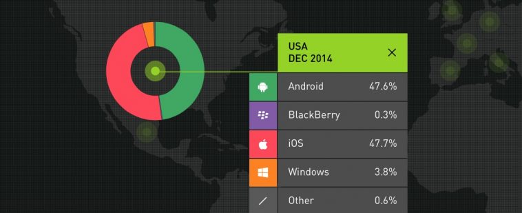iOS คิดสัดส่วนเป็น 47.7% ของสมาร์ทโฟนทั้งหมด ส่วนทาง Android ก็ฉิวเฉียดไปด้วยจำนวน 47.6% ในขณะที่อดีตผู้ยิ่งใหญ่อย่าง BlackBerry เหลือแค่เพียง 0.3% เท่านั้น ตามมาด้วย Windows Phone ที่มีสัดส่วนเพียง 3.8% (แต่ก็ยังถือว่าเยอะอยู่ เมื่อเทียบกับประเทศอื่น) ตามรายงานของ Kantar Worldpanel