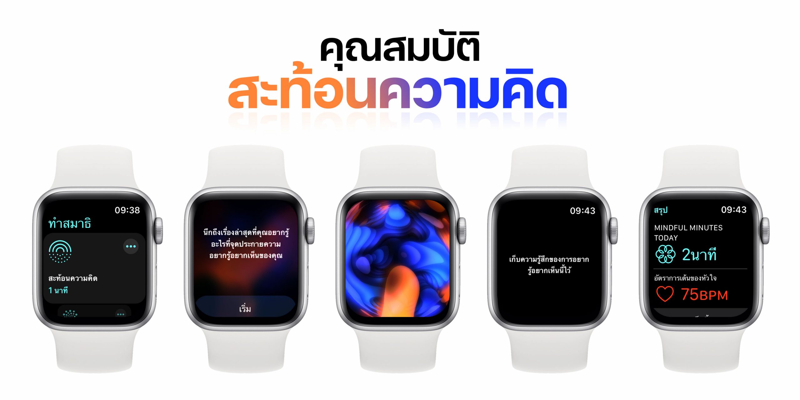 ฟีเจอร์สะท้อนความคิด ซึ่งฟีเจอร์นี้ จะช่วยให้เรามีสมาธิจดจ่ออยู่กับแอนิชันเคลื่อนไหวช้าๆ ที่จะช่วยให้เราตะหนักถึงความคิดในแต่ละวินาทีที่ผ่านไป ซึ่งเมื่อ เซสชั่นจบลง ก็จะมีการสรุปจำนวนนาทีและอัตราการเต้นของหัวใจเฉลี่ยต่อนาที