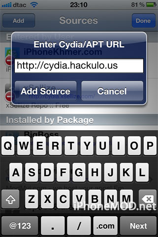 เปิด Cydia> Manage> Edit> Add> http://cydia.hackulo.us จากนั้นกด Add Source
