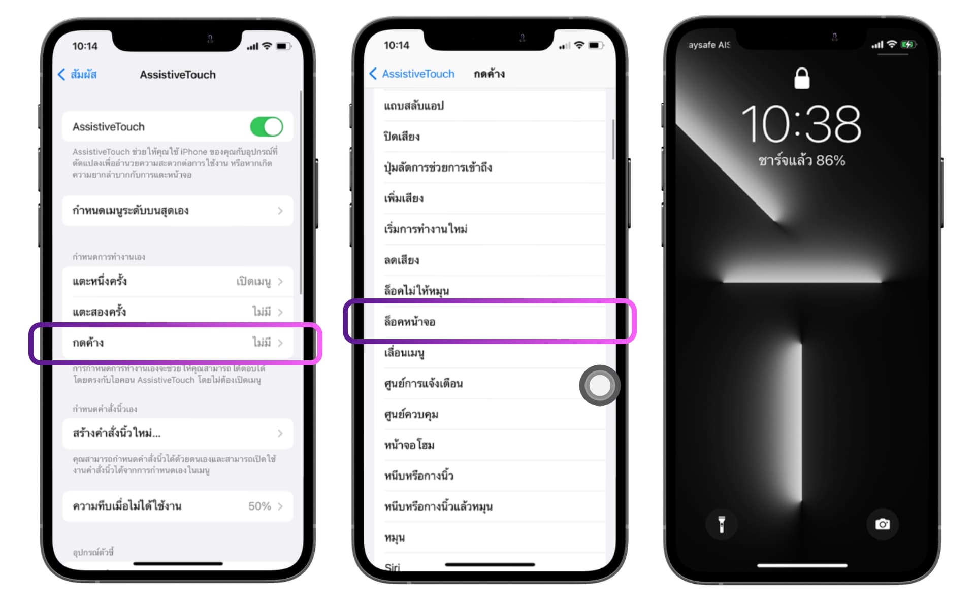 ที่เมนูการกำหนดการทำงานเอง ให้แตะที่ “แตะค้าง” หากเราเลือก “ล็อคหน้าจอ” เวลาที่เราแตะปุ่ม AssistiveTouch ค้างไว้ ก็จะเกิดการล็อคหน้าจอให้เลย เราสามารถใช้วิธีการนี้ในการล็อคหน้าจอแทนการกดปุ่มด้านข้างตัวเครื่องได้นั่นเอง