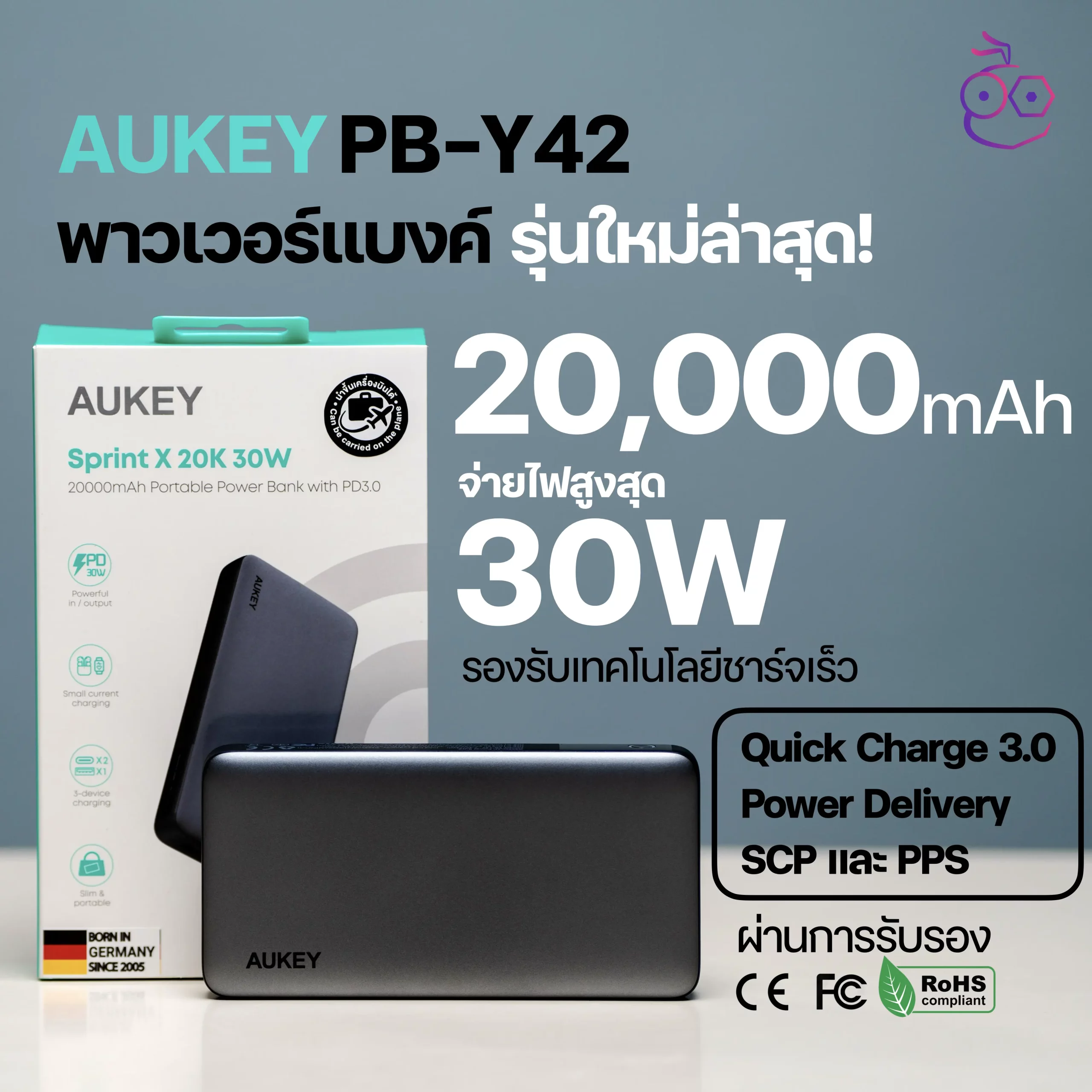 AUKEY PB-Y42: พาวเวอร์แบงค์รุ่นใหม่ล่าสุด! 20,000mAh จ่ายไฟสูงสุด 30W ชาร์จเร็วด้วย Quick Charge 3.0, PD, SCP และ PPS