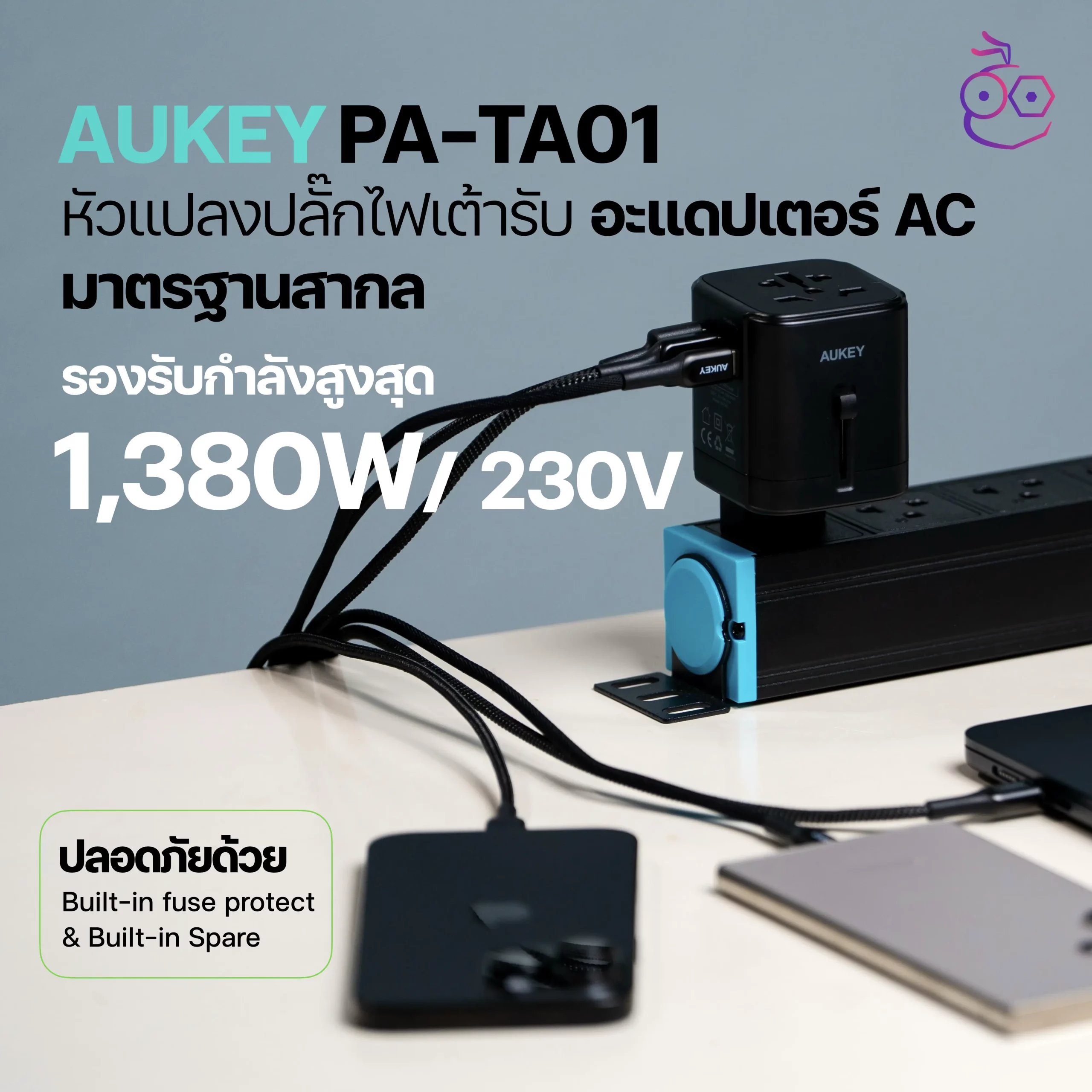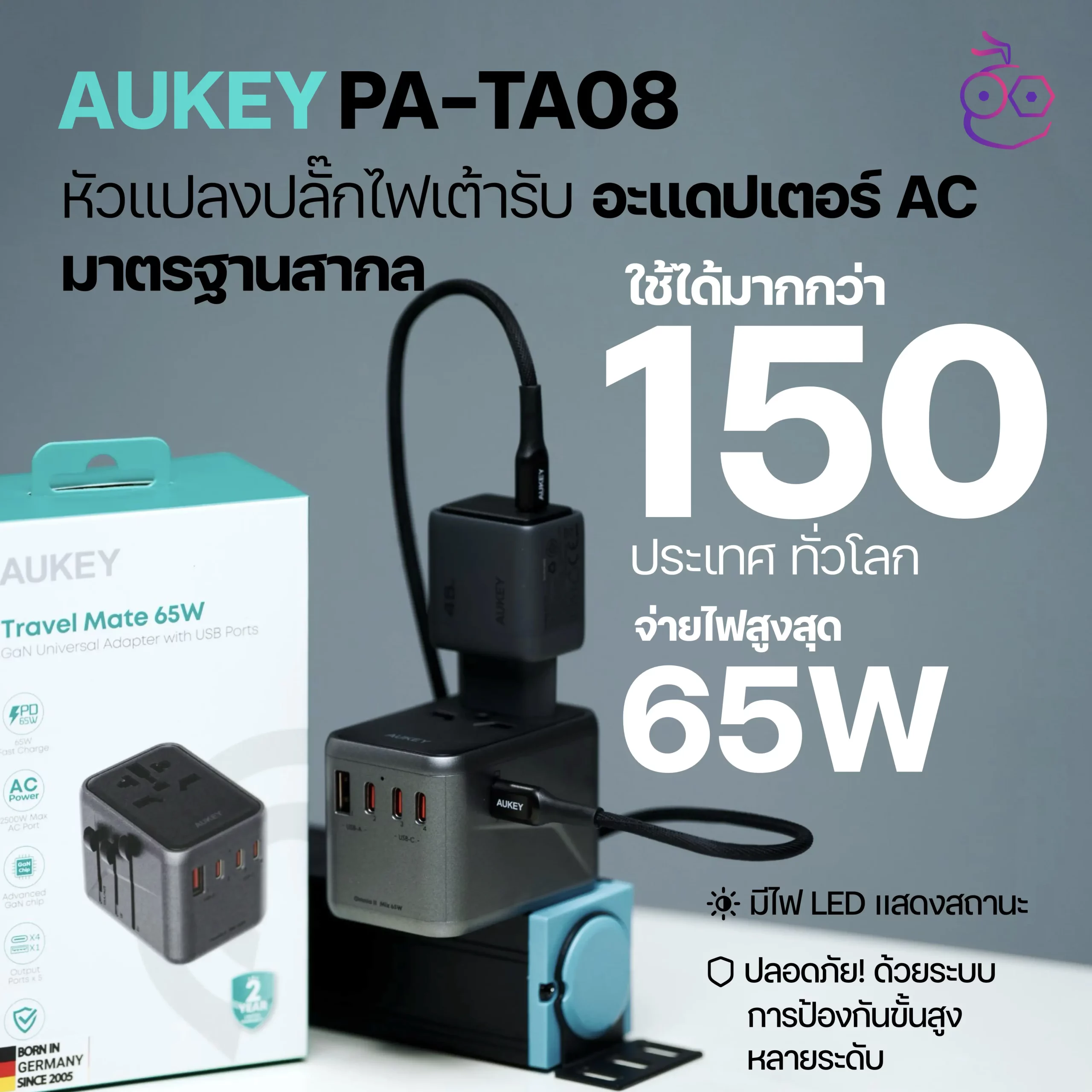 AUKEY PA-TA08: หัวแปลงปลั๊กไฟเต้ารับมาตรฐานสากล ใช้ได้ 150 ประเทศทั่วโลก จ่ายไฟสูงสุด 65W มีไฟ LED แสดงสถานะ และระบบป้องกันขั้นสูงหลายระดับ