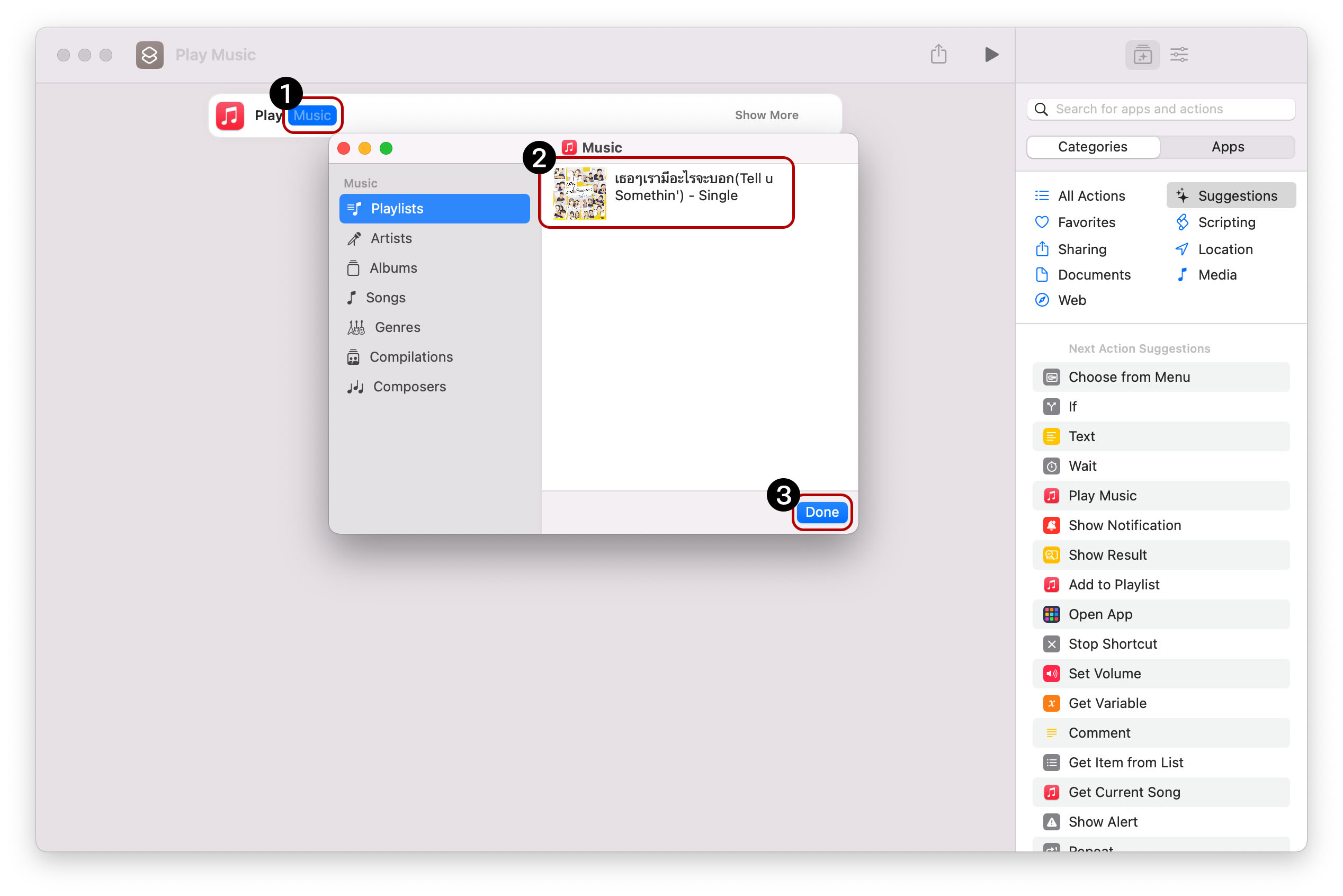 3. เลือก Music > เลือกเพลย์ลิสก์ที่ต้องการให้เปิดอัตโนมัติ > Done