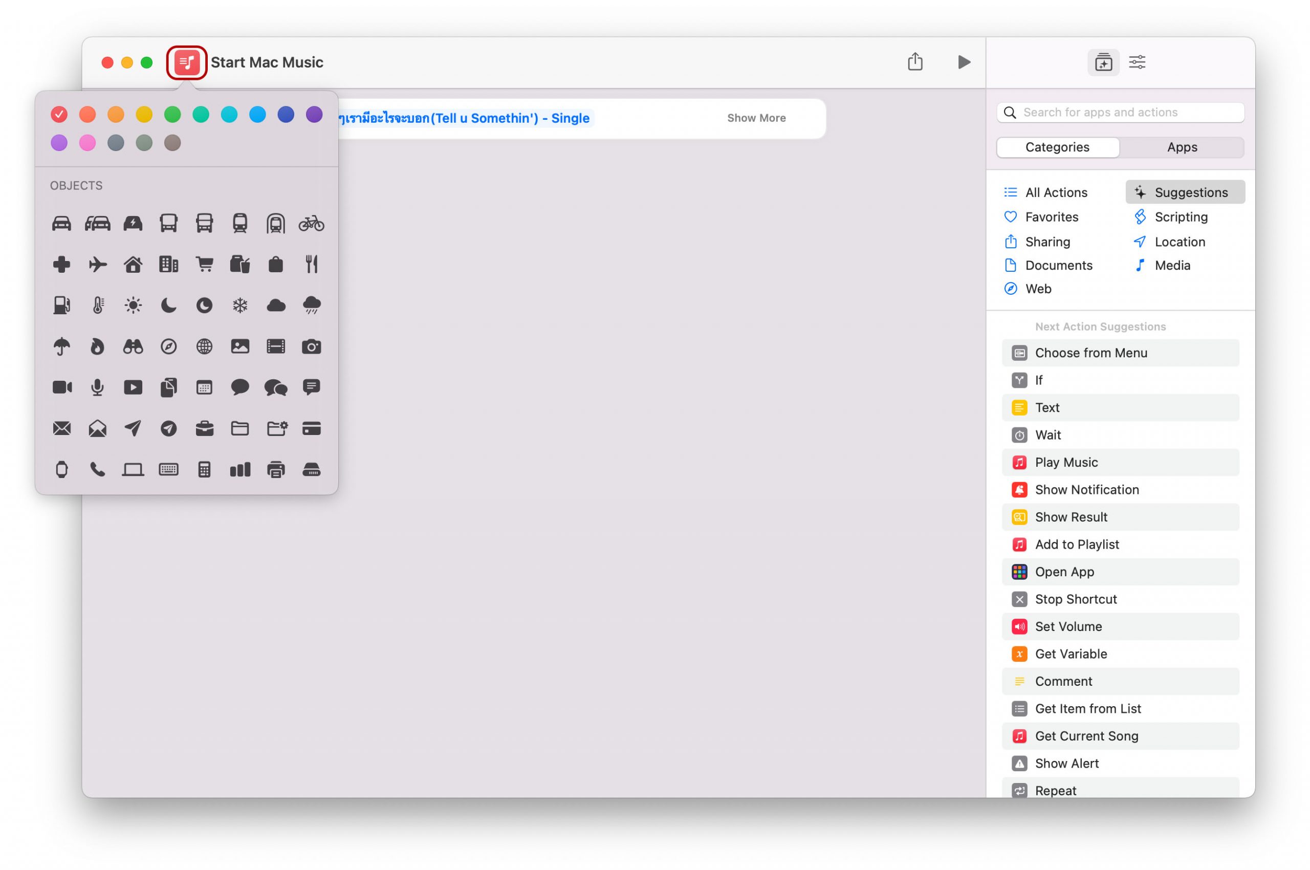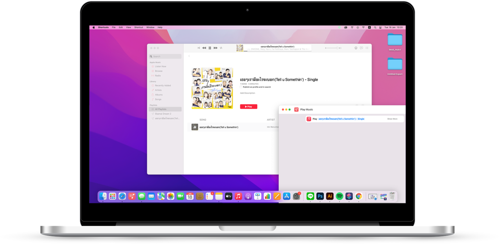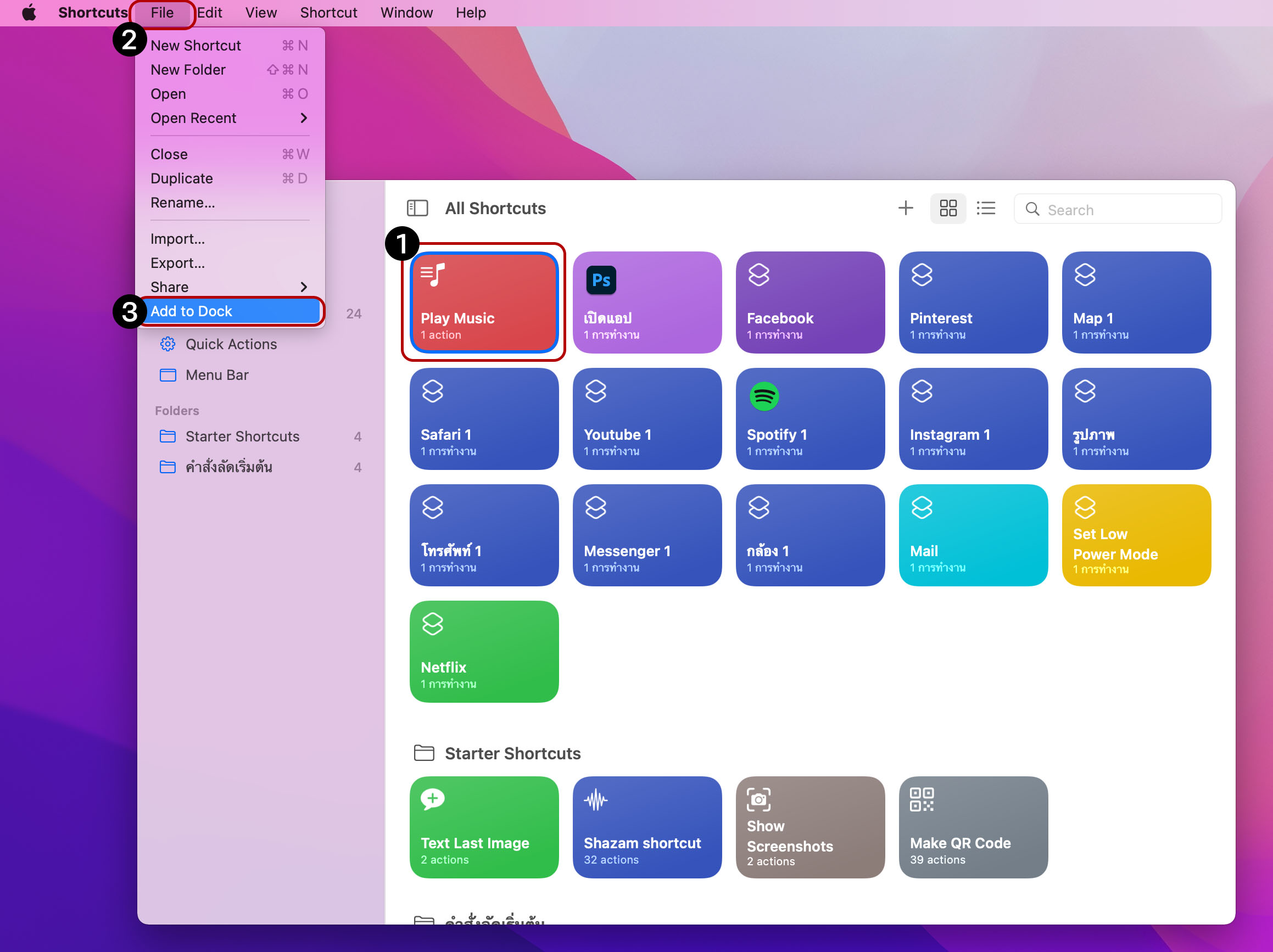 5. จากนั้นเพิ่ม Shortcut ลงบน Dock โดยแตะที่ Shortcut “Play Music” ที่เราสร้าง > File > Add to Dock