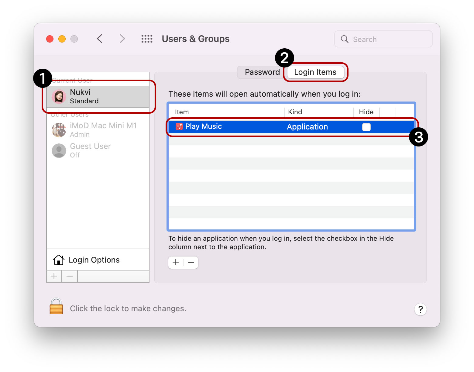 3. เลือก Users > Loin Items > เลือก Delete Play Music