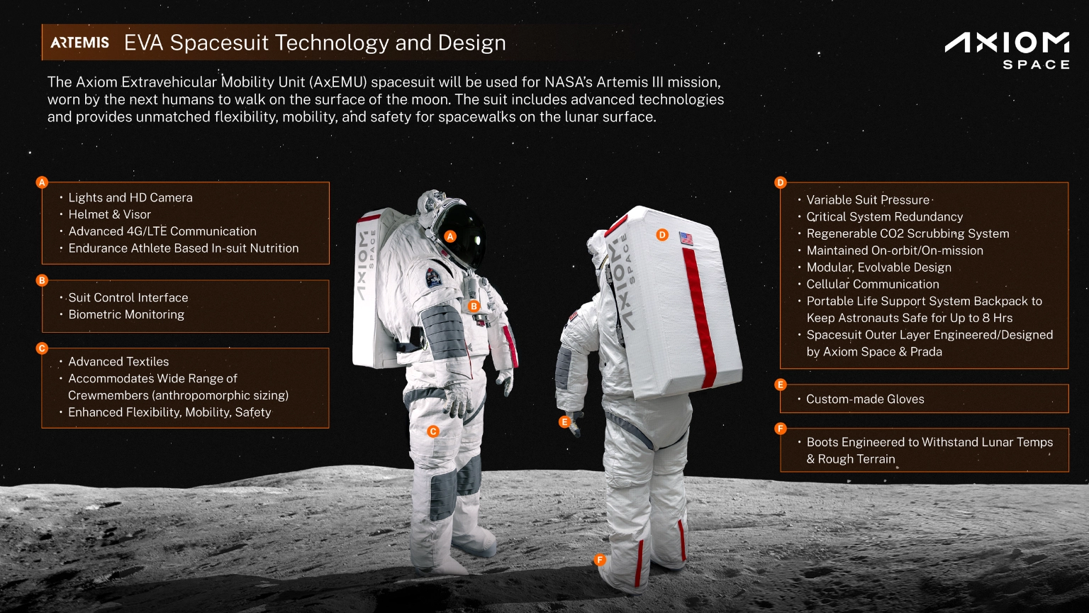 Axiom Space และ Prada ได้ร่วมกันเปิดตัวการออกแบบชุดอวกาศ Axiom Extravehicular Mobility Unit (AxEMU) ซึ่งจะถูกใช้ในภารกิจ Artemis III ของ NASA