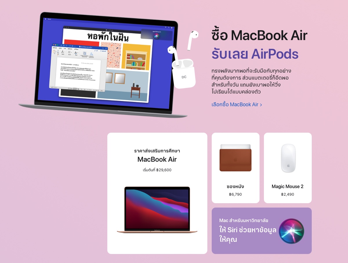 Apple ประกาศเปิดโปรแกรม Back to School ปี 2021 ในไทย มอบโปรโมชัน ซื้อ Mac หรือ iPad รุ่นที่ร่วมรายการในราคานักศึกษารับฟรี AirPods และส่วนลด 20% สำหรับ AppleCare+