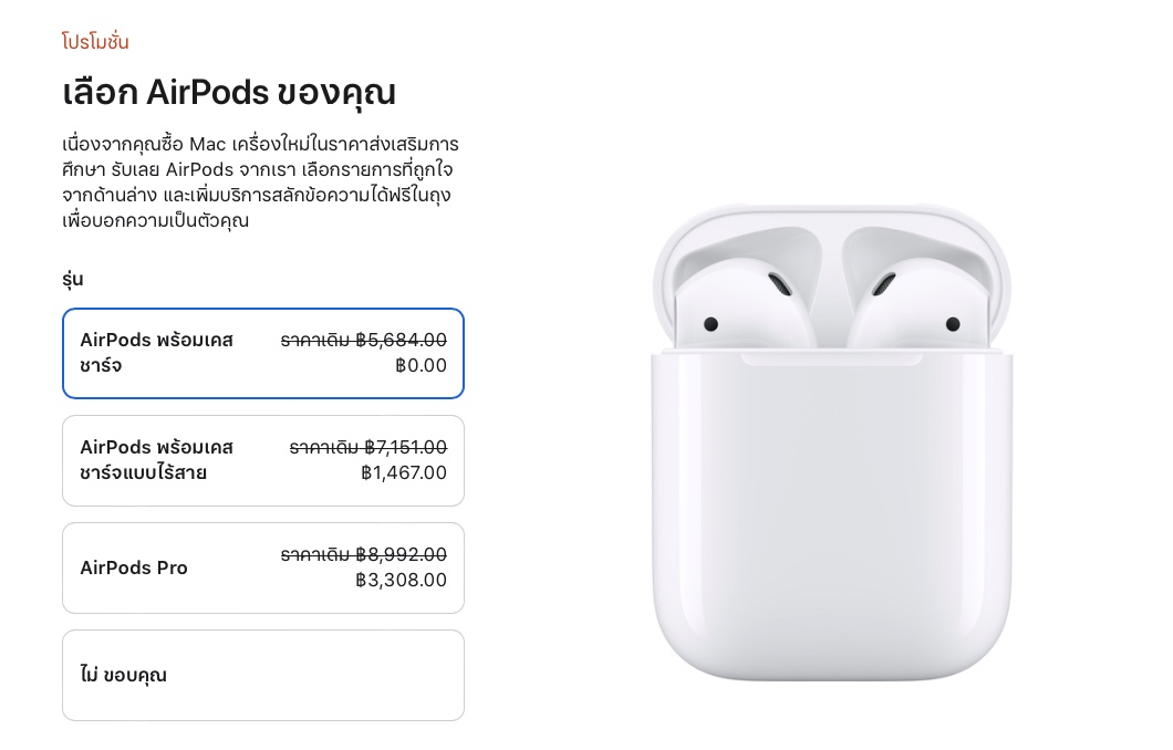| iPad | iPad Pro และ iPad Air (iPad รุ่นที่ 8 และ iPad mini ไม่เข้าร่วมรายการในข้อเสนอนี้) | AirPods พร้อมเคสชาร์จ | ฿5,684 |