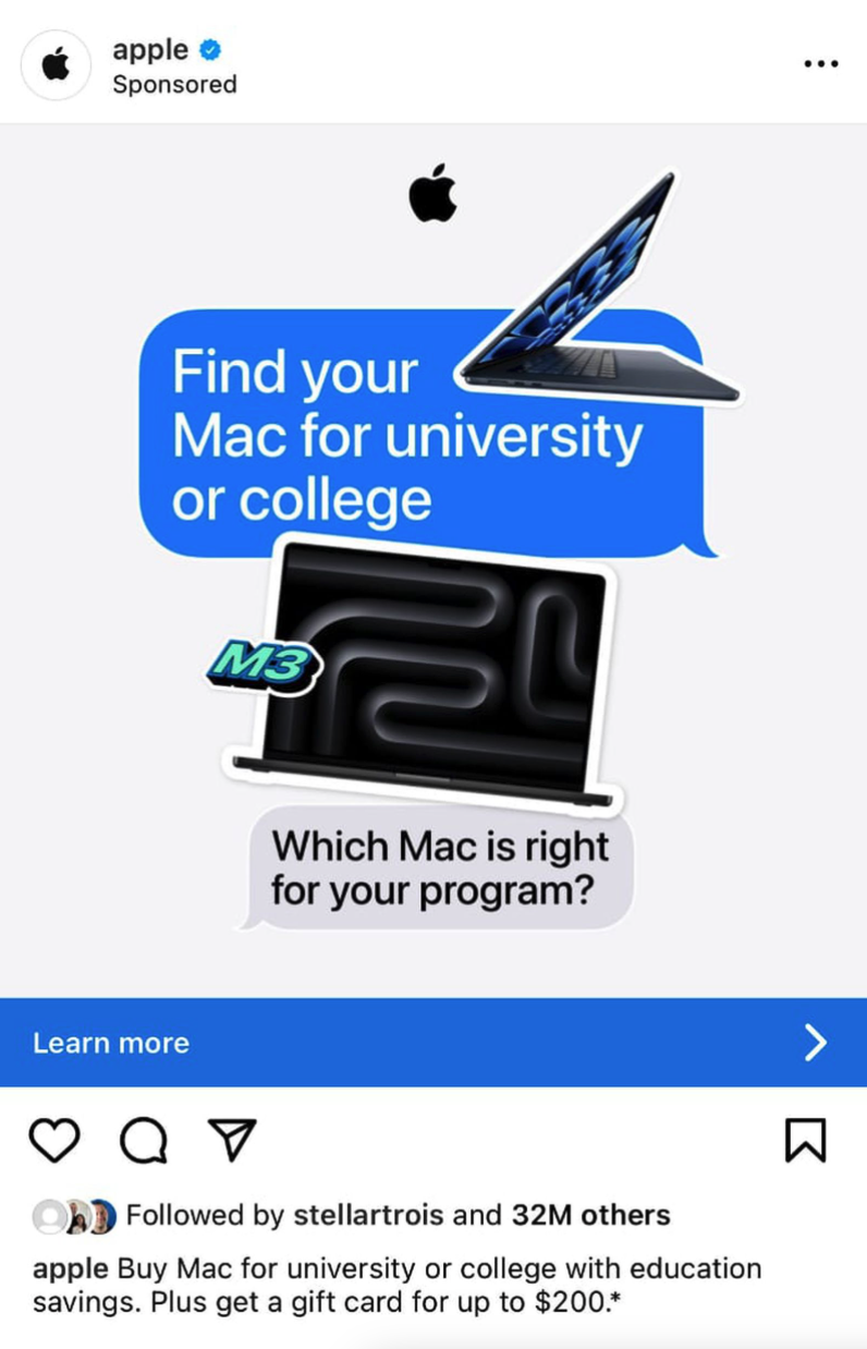 Apple ได้เริ่มโปรโมทโพสต์ Mac เพื่อการศึกษาใน Instagram โดยมีข้อความระบุว่า “ซื้อ Mac สำหรับมหาวิทยาลัยพร้อมส่วนลดการศึกษา พร้อมรับบัตรของขวัญส่วนลดมูลค่าสูงสุด 200 ดอลลาร์”