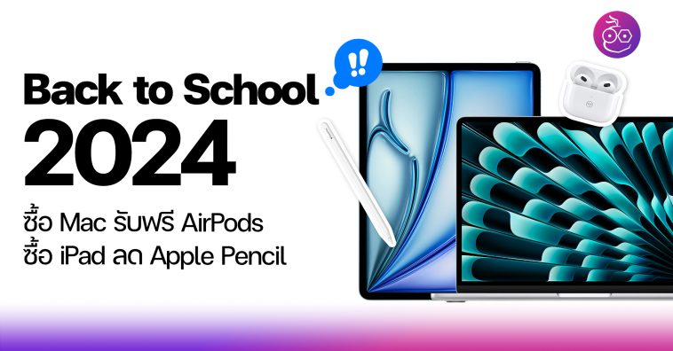 20 มิ.ย. 2024, Apple ได้ประกาศเริ่มโปรโมชัน Back to School 2024 ในไทย ซื้อ Mac รับฟรี AirPods, ซื้อ iPad รับฟรี Apple Pencil สิ้นสุด 30 ก.ย. 2024