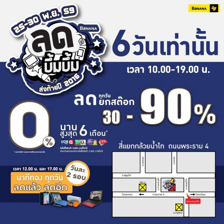 BaNANA ลด บึ้ม บึ้ม ส่งท้ายปี 2016 ถือว่าเป็นมหกรรมลดราคาล้างสต๊อคของ Banana ที่ลดราคาสินค้าไอทีสูงสุด 90% และมีผ่อนชำระ 0% กับบัตรเครดิตได้อีกด้วย