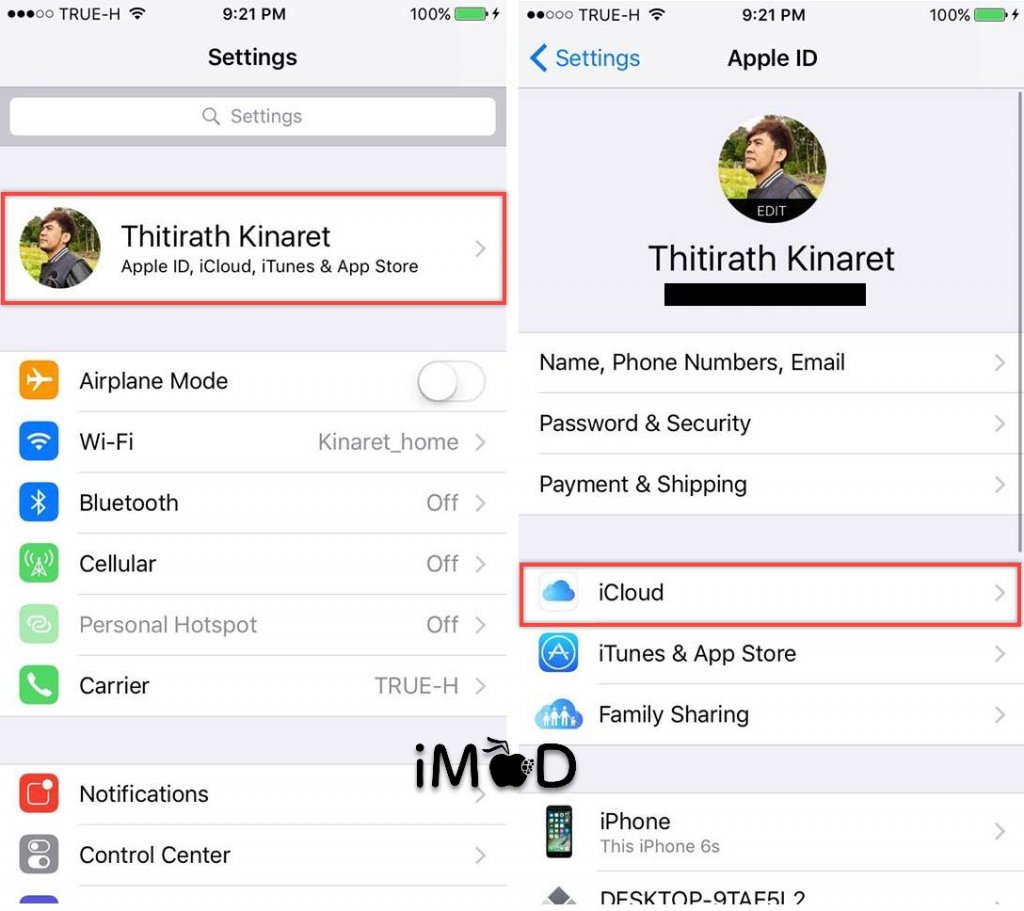 ไปที่ Settings > แตะที่ชื่อ Apple ID, iCloud, iTunes & App Store iCloud