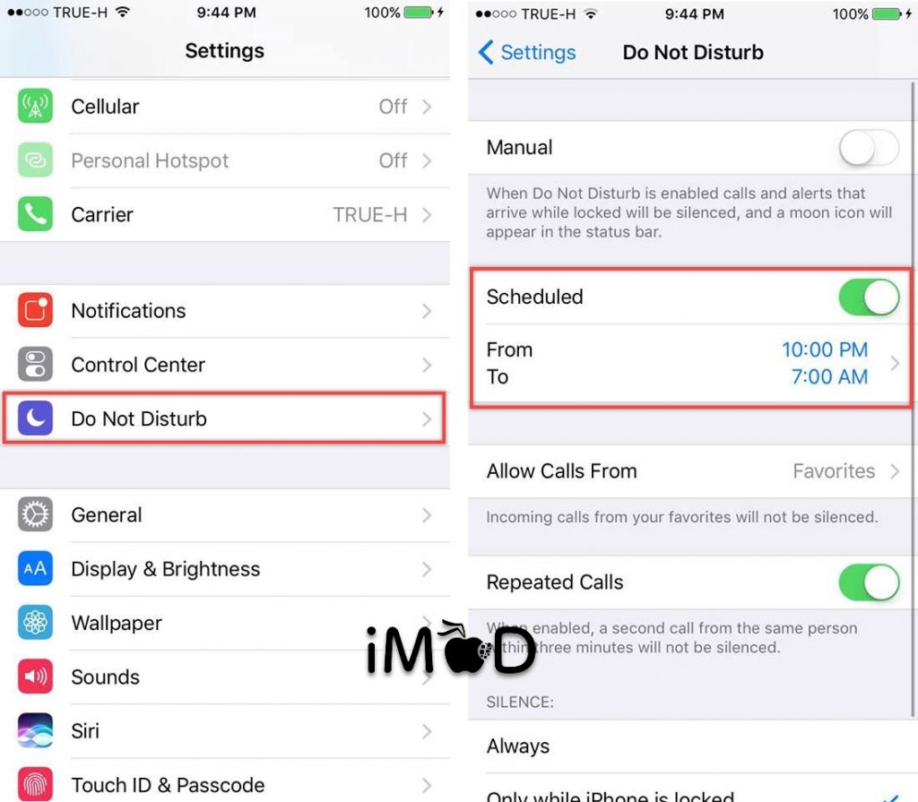 Do Not Disturb สามารถปรับตั้งค่าให้เปิดเองได้ หากเปิด Scheduled ให้เป็น On หมายถึง ถ้าเวลา 4 ทุ่ม – 7 โมงเช้าเครื่องจะอยู่ในโหมดห้ามรบกวน ข้อความแจ้งจะไม่ดัง โทรหาอาจจะไม่ติด ต้องโทรหลายๆ ครั้งถึงจะติด ประโยชน์ก็เพื่อเราจะได้พักผ่อนและไม่ให้ iPhone ส่งเสียงดังเตือนทั้งวันทั้งคืน