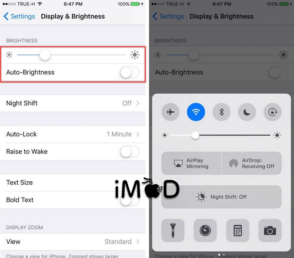 ไปที่ Settings > Display & Brightness ปิด Auto-Brightness และปรับระดับแสงการใช้งานทั่วไปให้อยู่ที่ประมาณ 40% แสงจะได้ไม่จ้าเกินและประหยัดพลังงาน ทั้งนี้หากต้องการแสงเพิ่มก็สามารถปรับที่ Control Center ได้
