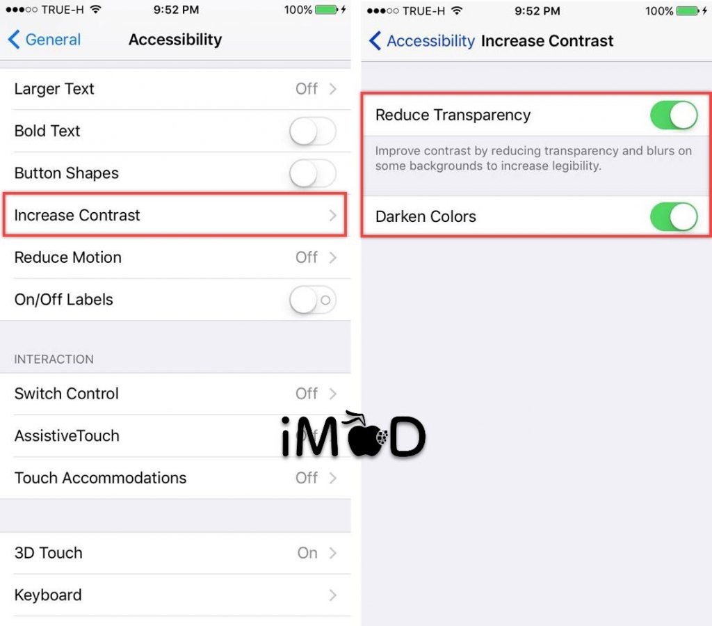 การเปิด Reduce Transparency จะช่วยลดการโปร่งแสงของเมนูต่างๆ ทำให้ระบบประมวลผลได้เร็ว และการเปิด Darken Color ทำให้ระบบลดแสงสีขาวลง ช่วยประหยัดแบตเตอรี่ได้มากขึ้น