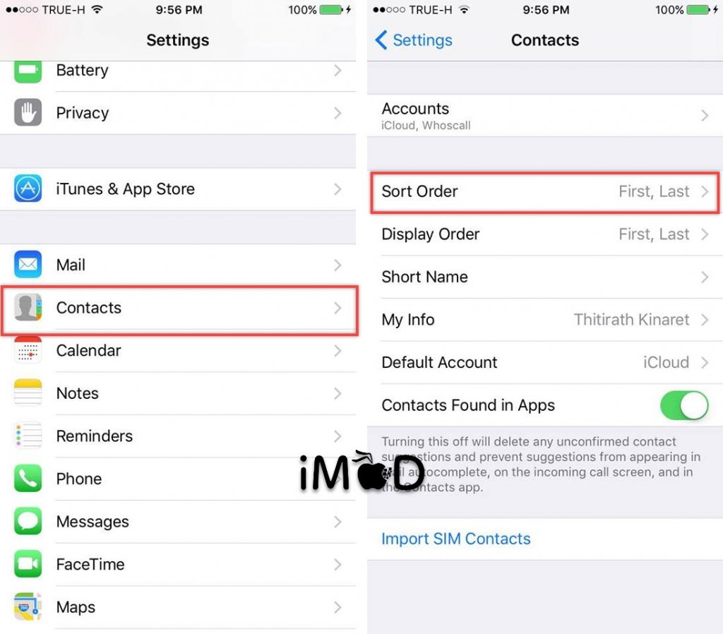 ไปที่ Settings > Contacts > Sort Order > First, Last