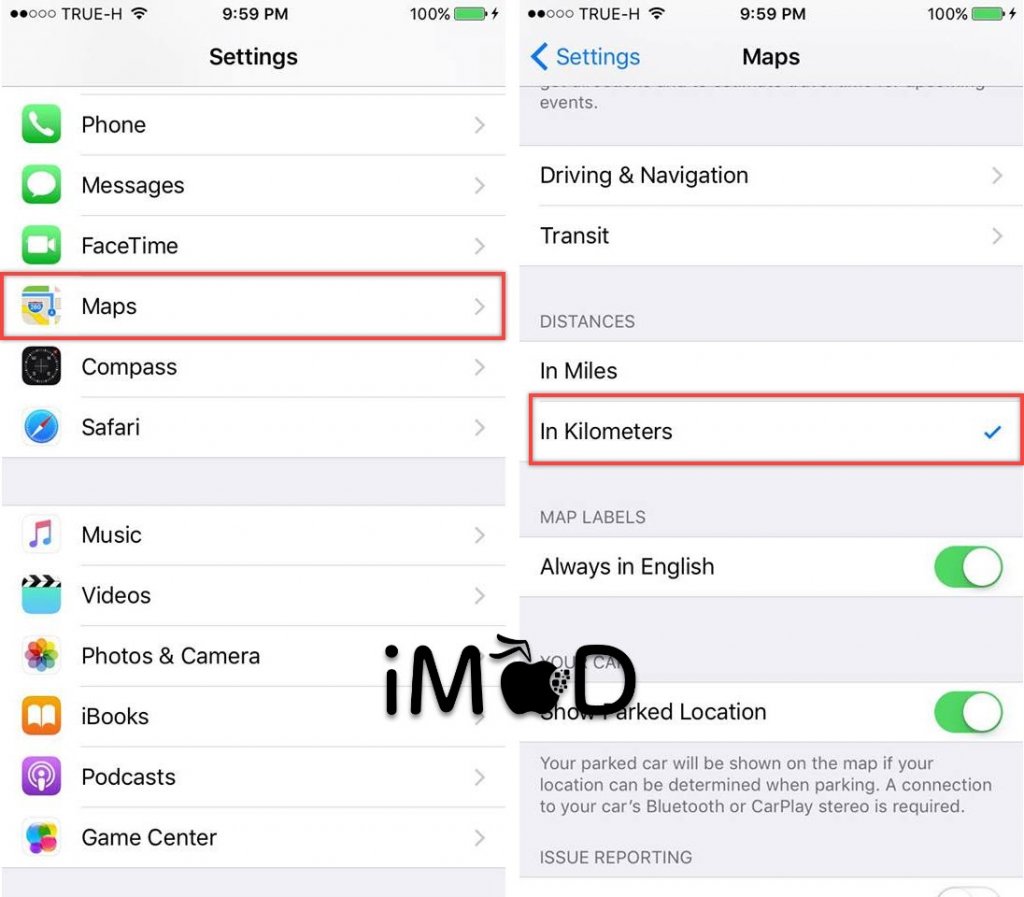 ไปที่ Settings > Maps > เลือก Distances เป็น in Kilometers (กิโลเมตร)
