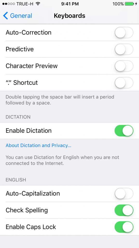 • ปิด Auto-Correction  (เสนอคำอัติโนมัติ) : ปิดไม่ให้ iPhone ฉลาดคิดคำแทนเราว่าเรากำลังจะพิมพ์อะไรเพราะส่วนใหญ่คิดคำผิดให้ความหมายเปลี่ยน