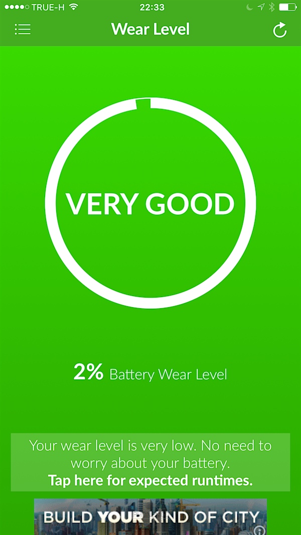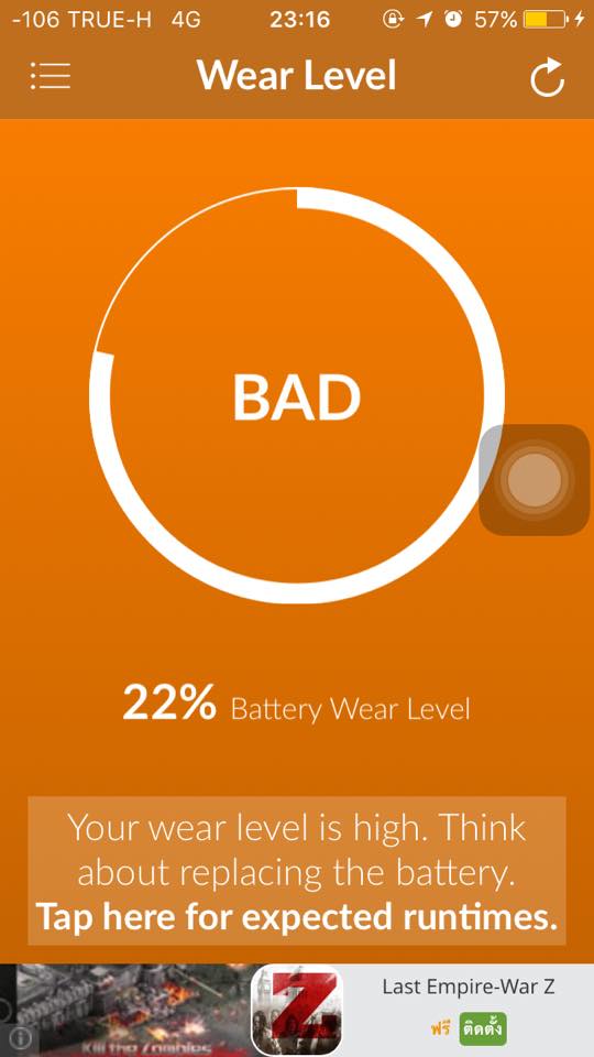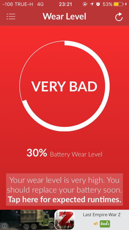 จากตัวอย่างด้านบนหลังเปิดแอปมาจะบอกเลยว่าประสิทธิภาพของแบตเรานั้นเป็นอย่างไร ถ้าสีเขียวก็ดีส่วนหากสีส้มก็จะแย่หน่อยส่วนถ้าเข้าขึ้นสีแดงก็ถือว่าประสิทธิภาพแบตแย่สุดๆ ควรจะเปลี่ยนได้แล้ว