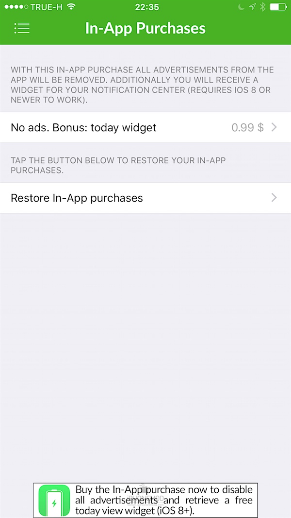 แอป Battery Life ตัวนี้ให้ใช้งานฟรีแต่ว่าจะมีโฆษณาติดมาและไม่สามารถใช้งาน Widget ได้ ดังนั้นหากใครอยากสนับสนุนนักพัฒนาสามารถซื้อแอปเพิ่มได้ในราคา $0.99 เพื่อปลดล็อคให้ใช้ฟีเจอร์เหล่านั้นได้เช่นกัน