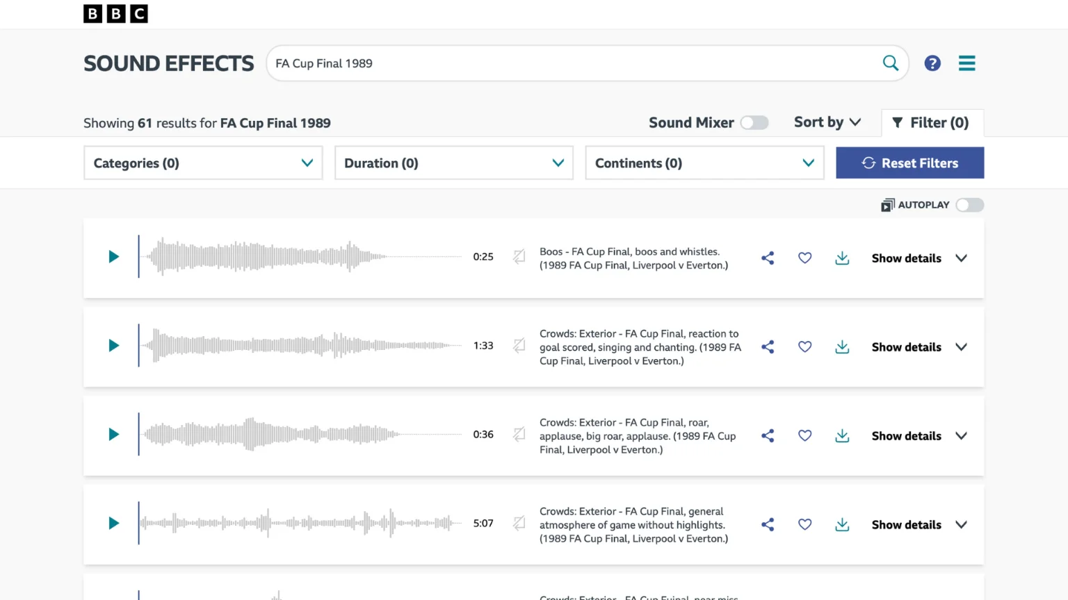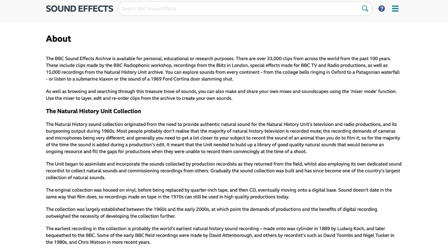 BBC ได้เปิดคลังเสียงเอฟเฟกต์กว่า 30,000 รายการให้ผู้ใช้งานทั่วไปสามารถดาวน์โหลดได้ฟรีผ่านโครงการ “BBC Sound Effects” ซึ่งเป็นแหล่งรวมเสียงที่มีคุณภาพสูงจากการบันทึกโดย BBC ตลอดหลายปีที่ใช้ในรายการวิทยุ โทรทัศน์ และการผลิตสื่ออื่น ๆ