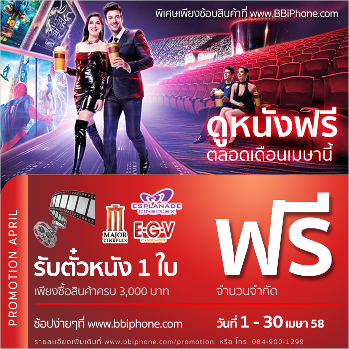 คนรักหนังไม่ควรพลาด BBiPhone.com ร่วมกับ โรงหนังเมเจอร์ แจกตั๋วหนัง “ตลอดเดือนเมษา 58 นี้” เพียงซื้อสินค้าครบ 3,000 บาท ที่ www.BBiPhone.com รับไปเลยตั๋วชมภาพยนตร์ 1 ที่นั่งทันที (เฉพาะที่นั่งปกติ) ดูได้ ทุกเรื่อง ทุกรอบ ที่โรงภาพยนตร์ในเครือเมเจอร์ ทุกสาขา ระยะเวลา 1 – 30 เมษายน 2558