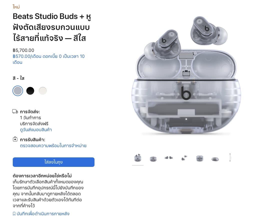 หูฟังไร้สาย Beats Studio Buds + ที่มีสีไฮไลท์คือ สีใส สั่งซื้อได้แล้ววันนี้ที่ Apple Store Online, แอป Apple Store และหน้าร้าน Apple Store ทั้ง 2 สาขา ราคา 5,700 บาท