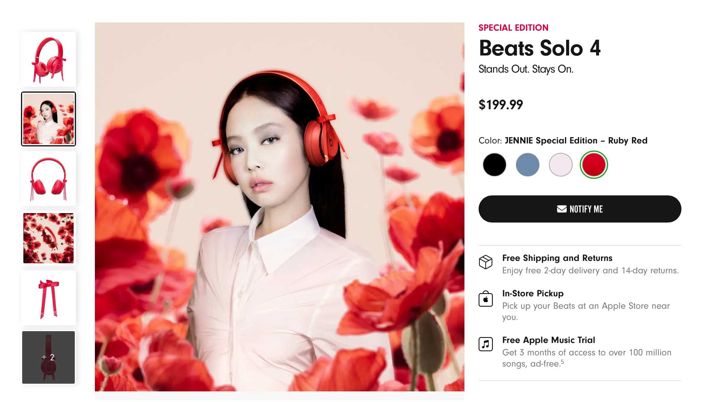 Apple ได้ประกาศความร่วมมือกับ Jennie Kim นักร้องดังจากเกาหลีใต้ เปิดตัวหูฟัง Beats Solo 4 “JENNIE Special Edition” รุ่นพิเศษ มาพร้อมกับสี Ruby Red โบว์สีแดงสองอันที่สามารถถอดได้ และกระเป๋าใส่ที่มีสีเข้าชุดกัน