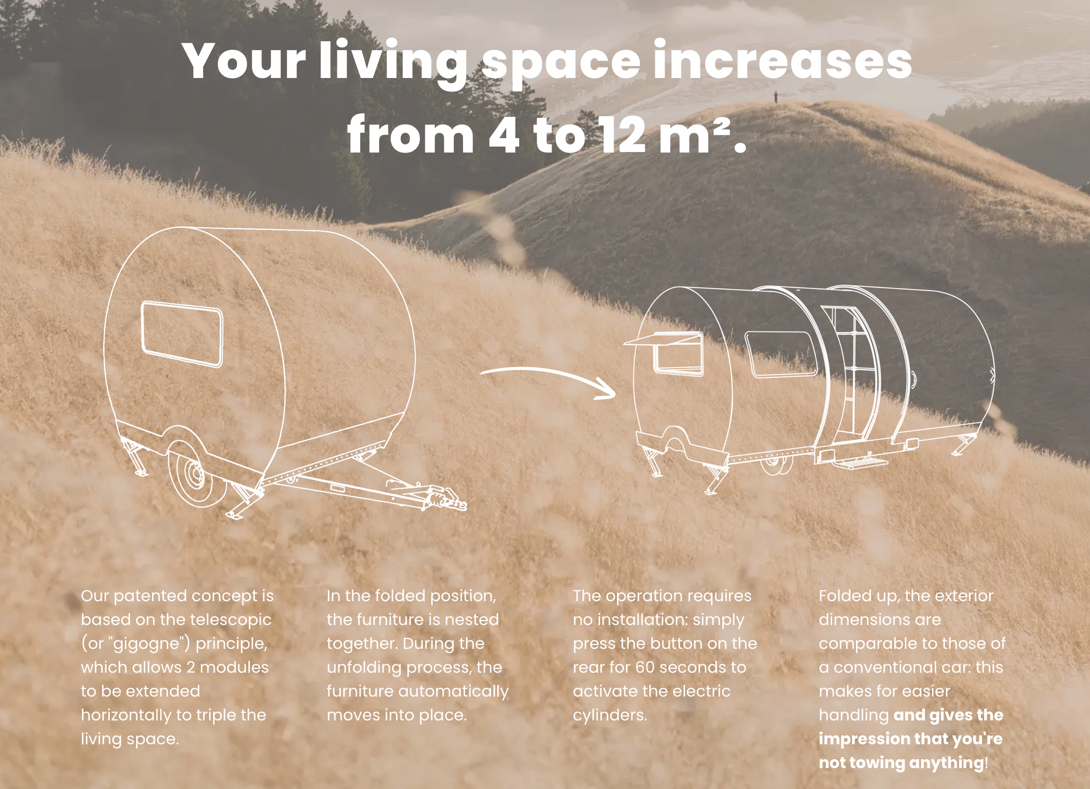 Beauer 3X รถบ้านพ่วงขนาดกะทัดรัดที่โดดเด่นด้วยการขยายพื้นที่ภายในได้ถึง 3 เท่า ภายในเวลาไม่ถึง 1 นาที ออกแบบยืดหดได้ ทำให้ผู้ใช้งานได้รับความสะดวกสบายเสมือนบ้านขนาดใหญ่ พร้อมความคล่องตัวในการเดินทาง