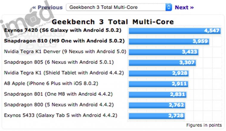 น่าเศร้าที่ iPhone 6 Plus ที่เคยได้แชมป์เป็นช่วงระยะเวลาหนึ่ง บัดนี้ถูกเบียดให้ตกโดย Galaxy S6 และ HTC One M9 เสียแล้ว (Exynos 7420 เร็วกว่า Snapdragon 810 ราว 15%)