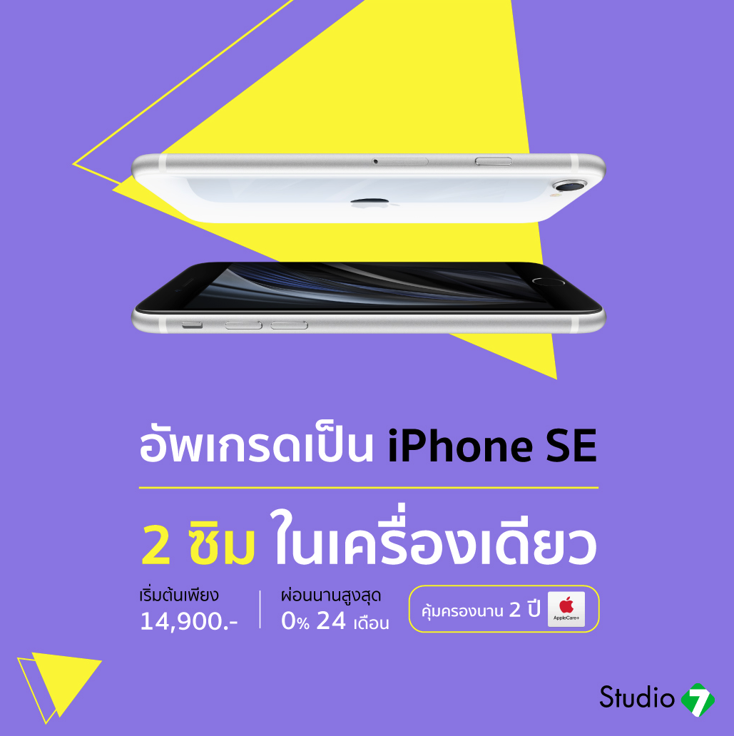 อัปเกรดเป็น iPhone SE  ราคาเริ่มต้นเพียง 14,900.- ผ่อนสบาย 0% นาน 24 เดือน* พร้อมรับส่วนลดทันที 24%** พบกันที่ร้าน Studio 7 สาขาใกล้บ้าน