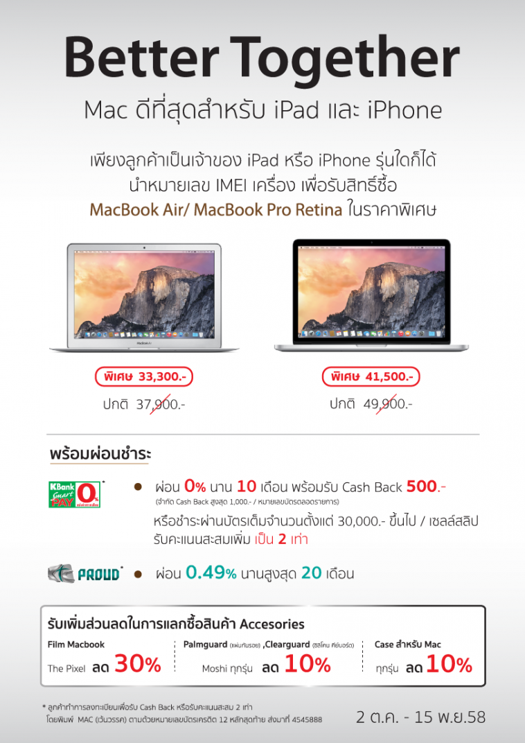 นอกจากนี้ยังสามารถผ่อนนานสูงสุด 20 เดือน หรือเลือกผ่อนนาน 10 เดือน พร้อมรับ Cash Back สูงสุด 1,000 บาท (กับบัตรเครดิตที่ร่วมรายการ) และรับเพิ่มส่วนลดในการแลกซื้อสินค้า Accessories เพียงแค่นำ iPhone หรือ iPad มาแสดงพร้อม IMEI