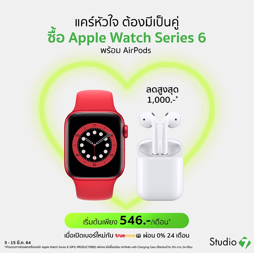 - Apple Watch Series 6 ซื้อเดี่ยวลดสูงสุด 700 บาท และลดเพิ่มสูงสุด 700 บาท เมื่อซื้อคู่ AirPods with Charging Case
