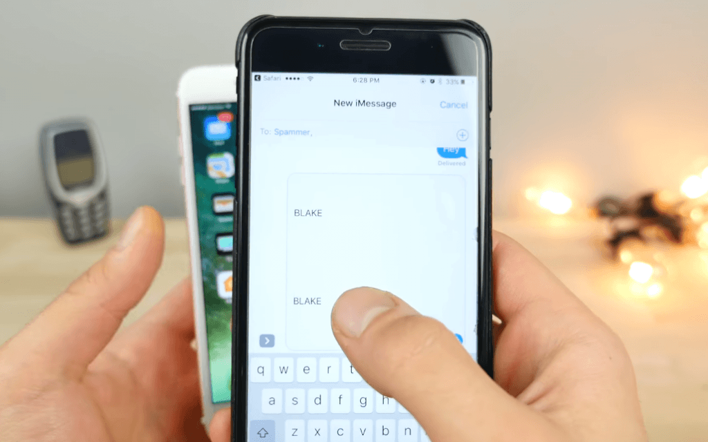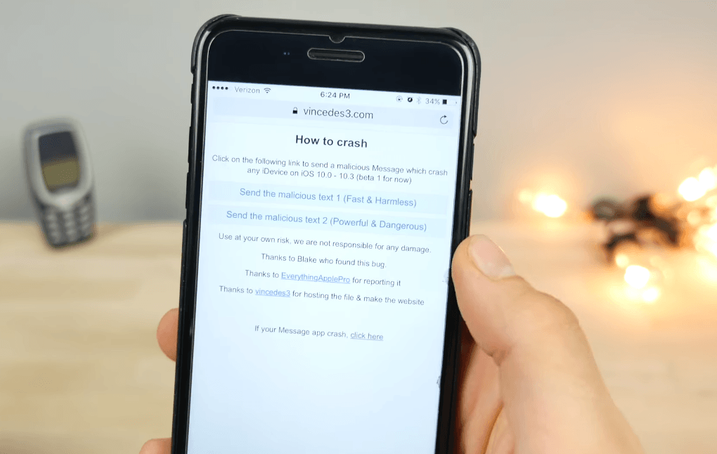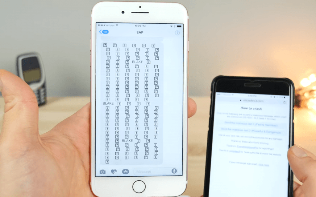 สำหรับข้อความที่ทำให้ iPhone iOS 10 ถึง iOS 10.3 เครื่องค้าง จะเป็นข้อความที่มีคำว่า BLAKE อันตรายของมันก็คือ เมื่อผู้ไม่หวังดีส่งข้อความมาแล้วมีการแจ้งเตือน iPhone ที่ได้รับข้อความจะค้างทันที ใช้งานไม่ได้ 15-20 วินาที ถึงแม้ว่าจะไม่เปิดข้อความอ่านก็ตาม