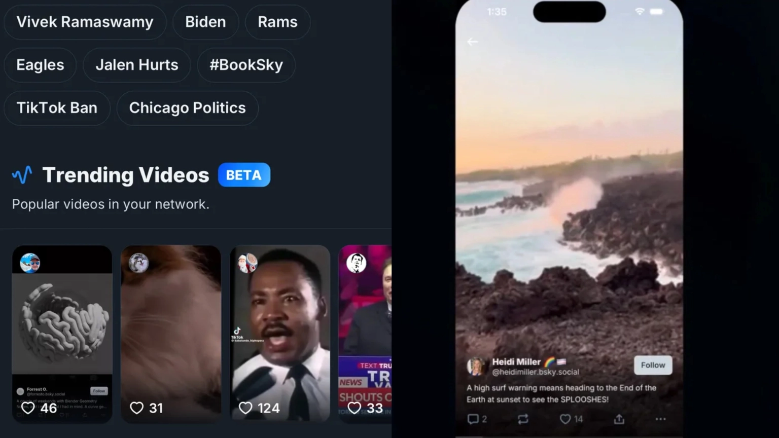 Bluesky กล่าวพร้อมกับเปิดตัวฟีดวิดีโอที่ปรับแต่งได้ ผู้ใช้สามารถปัดขึ้นหรือลงบนฟีดเหล่านี้เพื่อดูวิดีโอและสร้างฟีดที่กำหนดเป้าหมายซึ่งดึงเนื้อหาวิดีโอเฉพาะจากแฮชแท็กที่ระบุ เช่น ฟีด #BookSky นี้ที่ดึงดูดชุมชนการอ่าน “BookTok” ของ TikTok