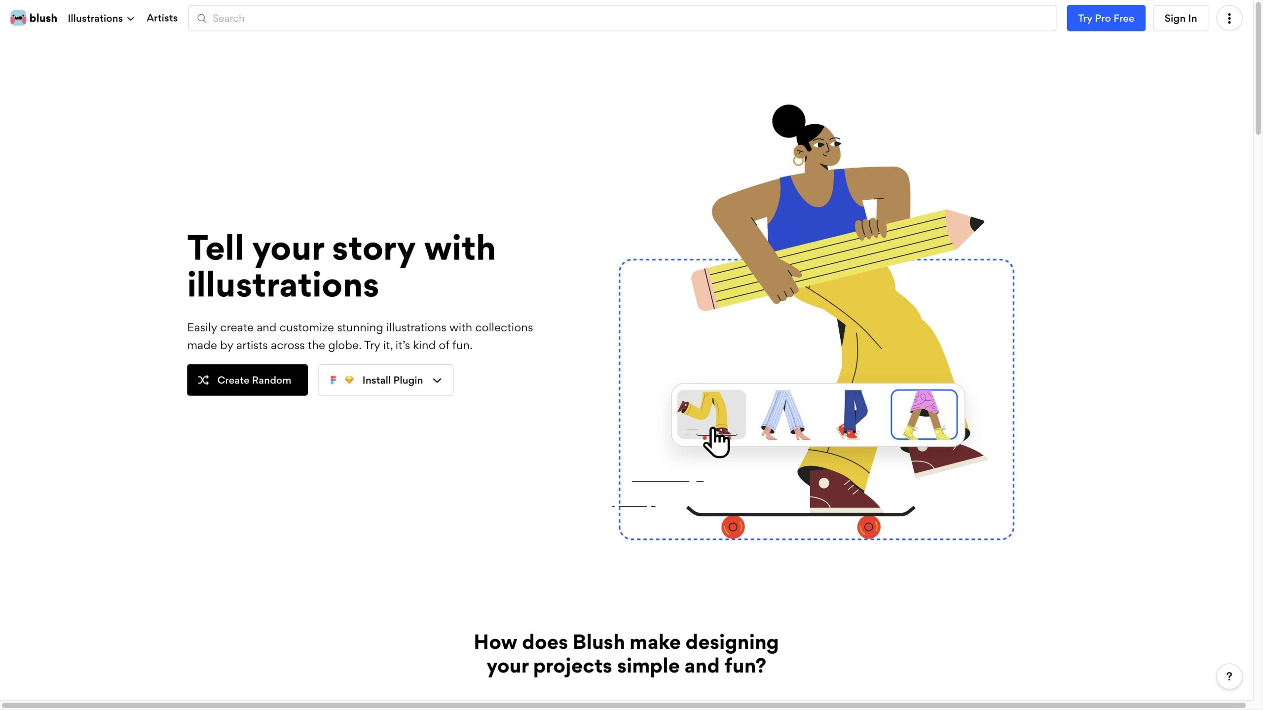 เว็บ Blush นั้นพอเข้ามาที่หน้าแรกจะมีให้กด “Create Random” เพื่อสุ่มรูป PNG ต่าง ๆ ในเว็บ ส่วน “Install Plugin” ต้องเป็นพรีเมี่ยมถึงจะใช้ได้