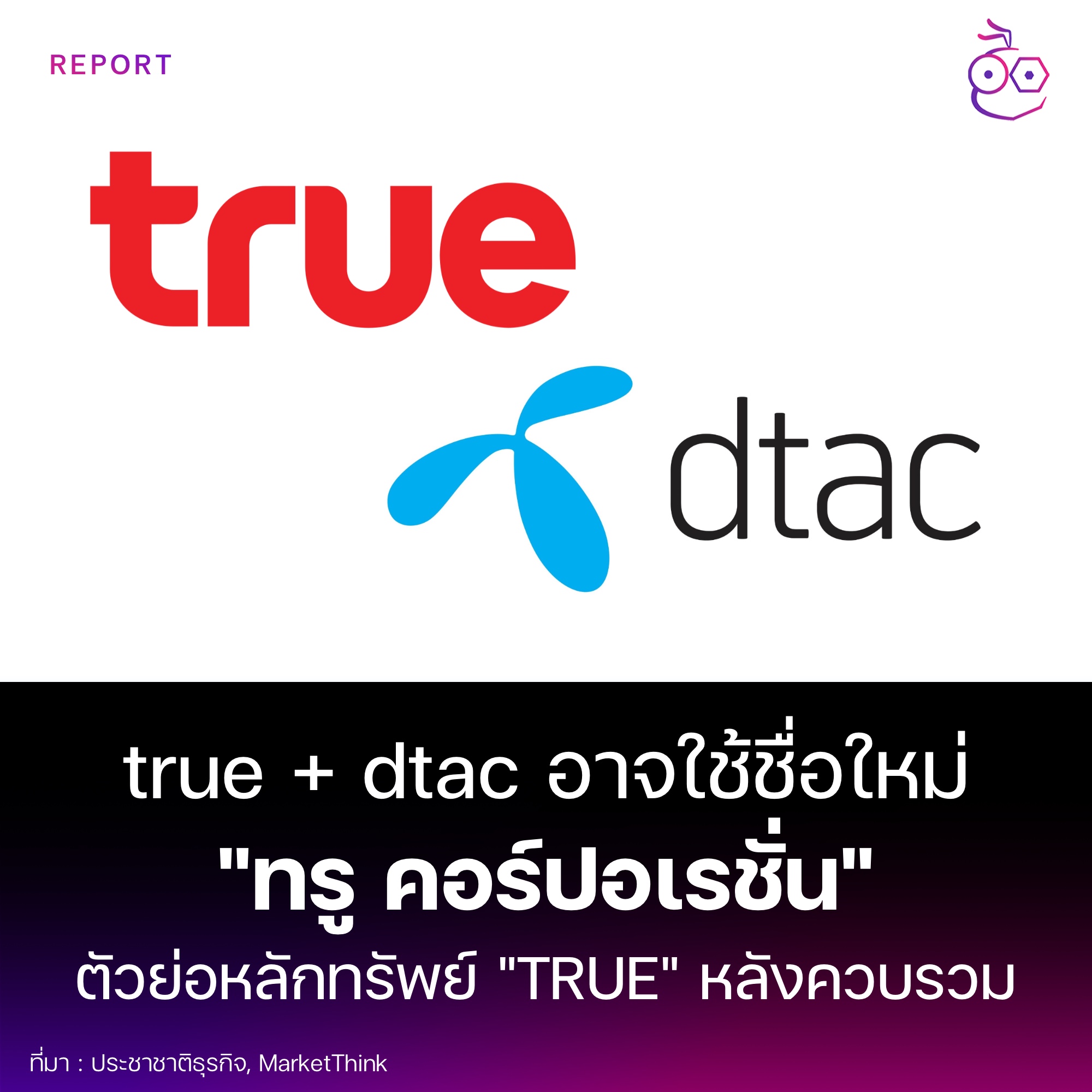 สำหรับชื่อบริษัทที่ได้รับการเสนอในการจดทะเบียนบริษัทใหม่ที่ควบรวมคือ “บริษัท ทรู คอร์ปอเรชั่น จำกัด (มหาชน)” โดยที่ทั้งแบรนด์ทรูและดีแทคเป็นแบรนด์ที่แข็งแกร่งในอุตสาหกรรมโทรคมนาคม ในขณะที่แบรนด์ทรูยังเป็นที่รู้จักครอบคลุมถึงธุรกิจบริการบรอดแบนด์อินเทอร์เน็ต โทรทัศน์แบบบอกรับสมาชิก และบริการดิจิทัล ทั้งนี้ หลังจากการควบรวม ทั้งแบรนด์ดีแทคและทรูจะยังคงแยกกันให้บริการลูกค้าของตนเองอย่างต่อเนื่อง เพื่อนำเสนอทางเลือกที่หลากหลายสำหรับผู้บริโภค และสามารถแข่งขันได้ในตลาดต่อไป